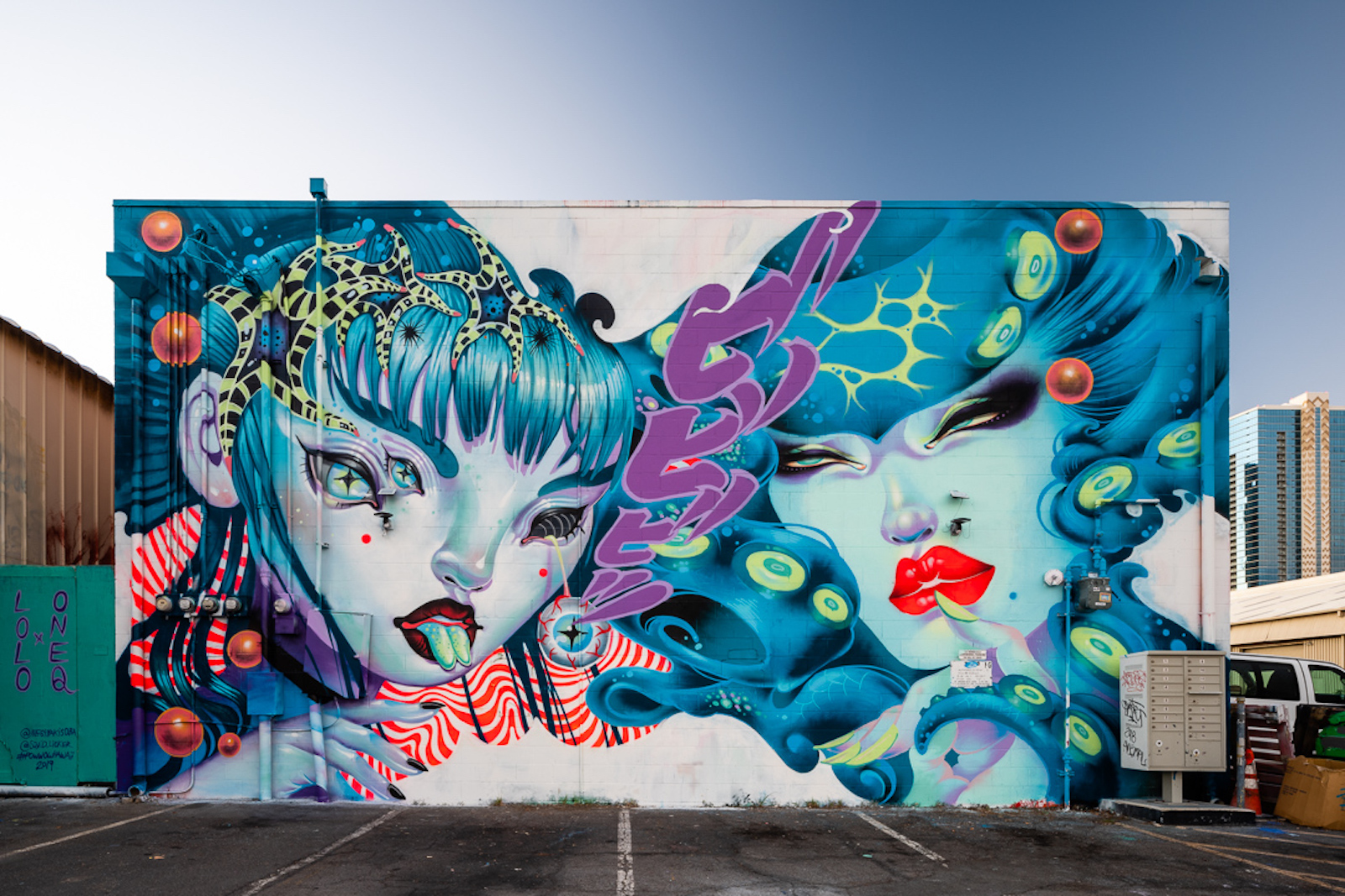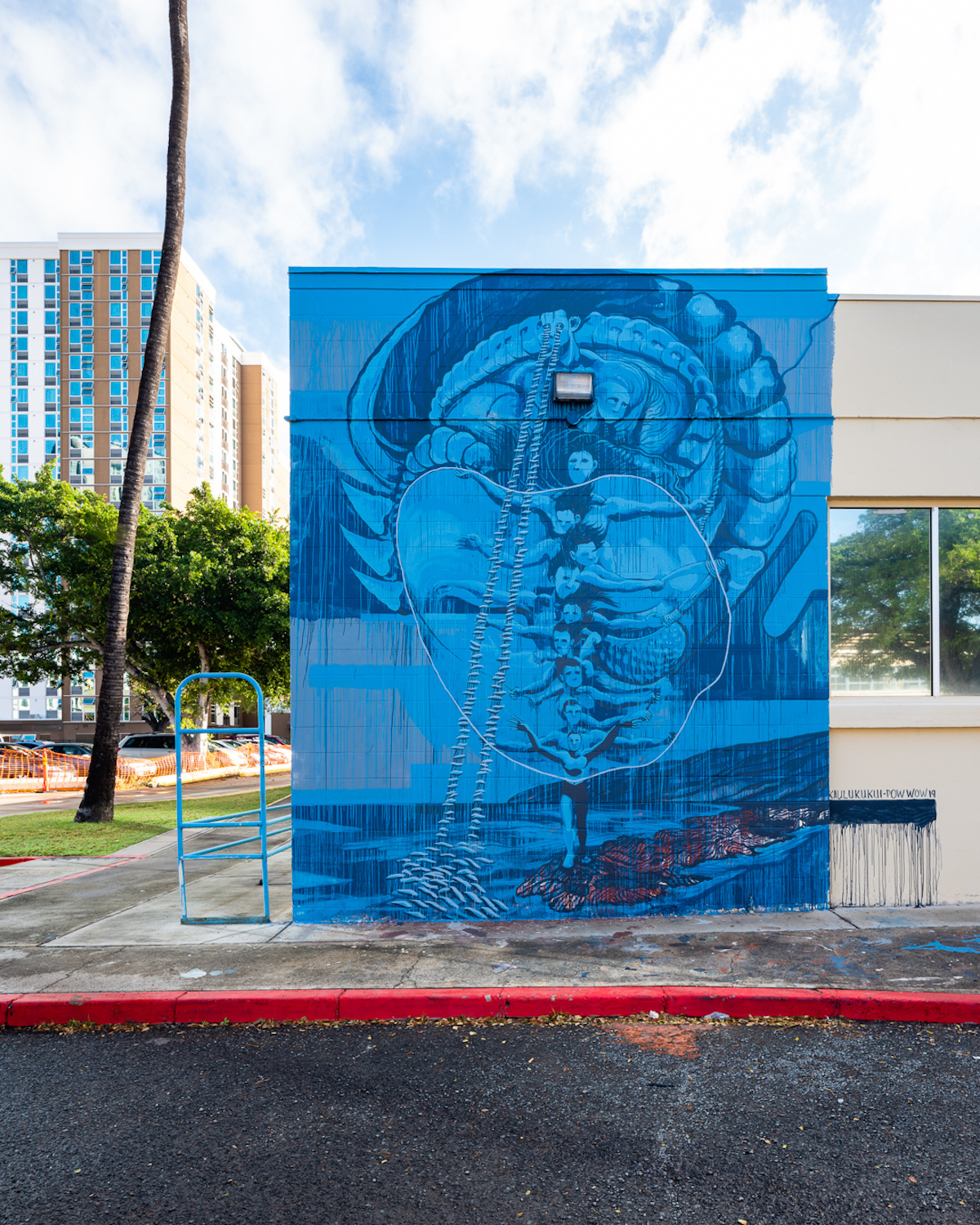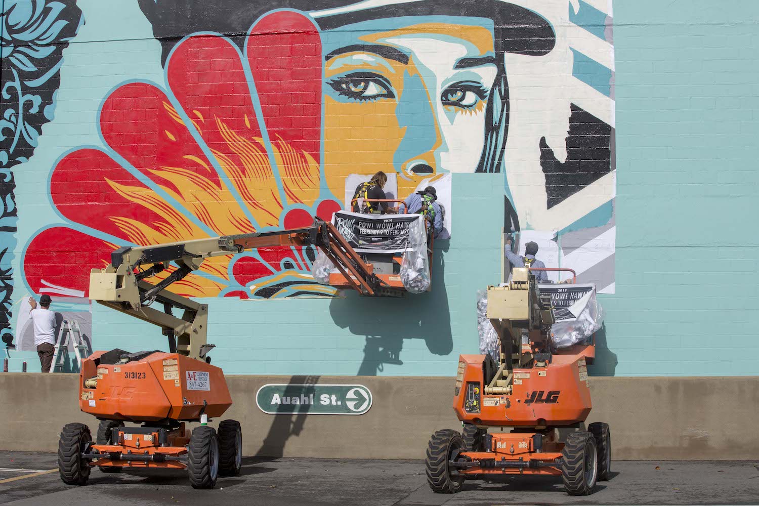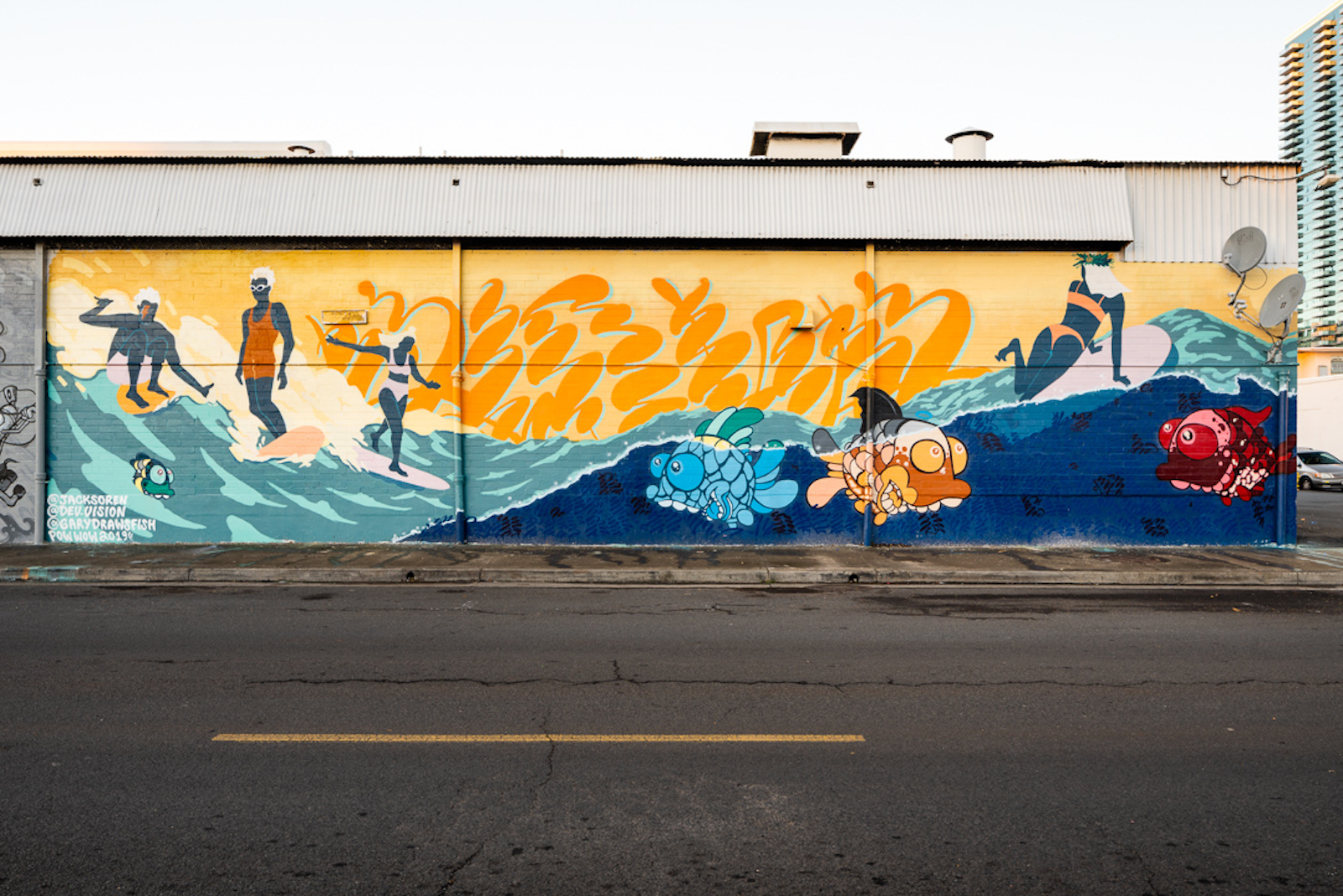POW! WOW! Hawaii 2019 invited local and international artists to the beautiful town of Oahu, Visiting Artist Roster included Amy Sol (California), Lauren YS (California), Ekundayo (Hawaii/Washington), Joao Ruas (Brazil), Reeder One (California), Mr. Hahn of Linkin Park (Hawaii/California), ONEQ (Japan), Crash (New York), Mike McGinn of World of Dance (California), Spidertag (Spain), How Nosm (New York), Logan Hicks (New York), Zepha (France), Roamcouch (Japan), Superdeux (California), Shepard Fairey (California), Kevin Lyons (New York), Mayo (Australia), Drew Young (Canada), Eddy Angel (Florida), Aaron De La Cruz (California), Woes (Hawaii/California) and OG Slick (Hawaii/California). Local artists included 7sketches (California),Asalt (Hawaii), Cme (Hawaii),Cory Taum (Hawaii), Ckaweeks (Hawaii), Devour (Hawaii), Gary Draws Fish (Hawaii), Gavin Murai (Hawaii), Jasper Wong (Hawaii), Jeffrey Gress (Hawaii), Dak1ne (Hawaii), Kahiau Beamer (Hawaii), Kai Kaulukukui (Hawaii), Kamea Hadar (Hawaii), Kaplan Bunce (Hawaii), Katch (Hawaii), Kate Wadsworth (Hawaii), Kealakukui of 808Urban (Hawaii), Kris Goto (Hawaii), Lucky Olelo (Hawaii), Luke Dekneef (Hawaii), Render (Hawaii), Matthew Tapia (Hawaii), Maek (Hawaii), Melon James (Hawaii), Jesico Serrano (Hawaii), Oera (Hawaii), Prime (Hawaii), Puff (Hawaii), Sidy (Hawaii), Jack Soren (Hawaii), Nanea Lum (Hawaii), Ran Noveck (Hawaii), Solomon Enos (Hawaii), Unomas (Hawaii), Wooden Wave (Hawaii), Mystic (Hawaii), Gezu (Hawaii), Retsy (Hawaii) and Katoe (Hawaii).
