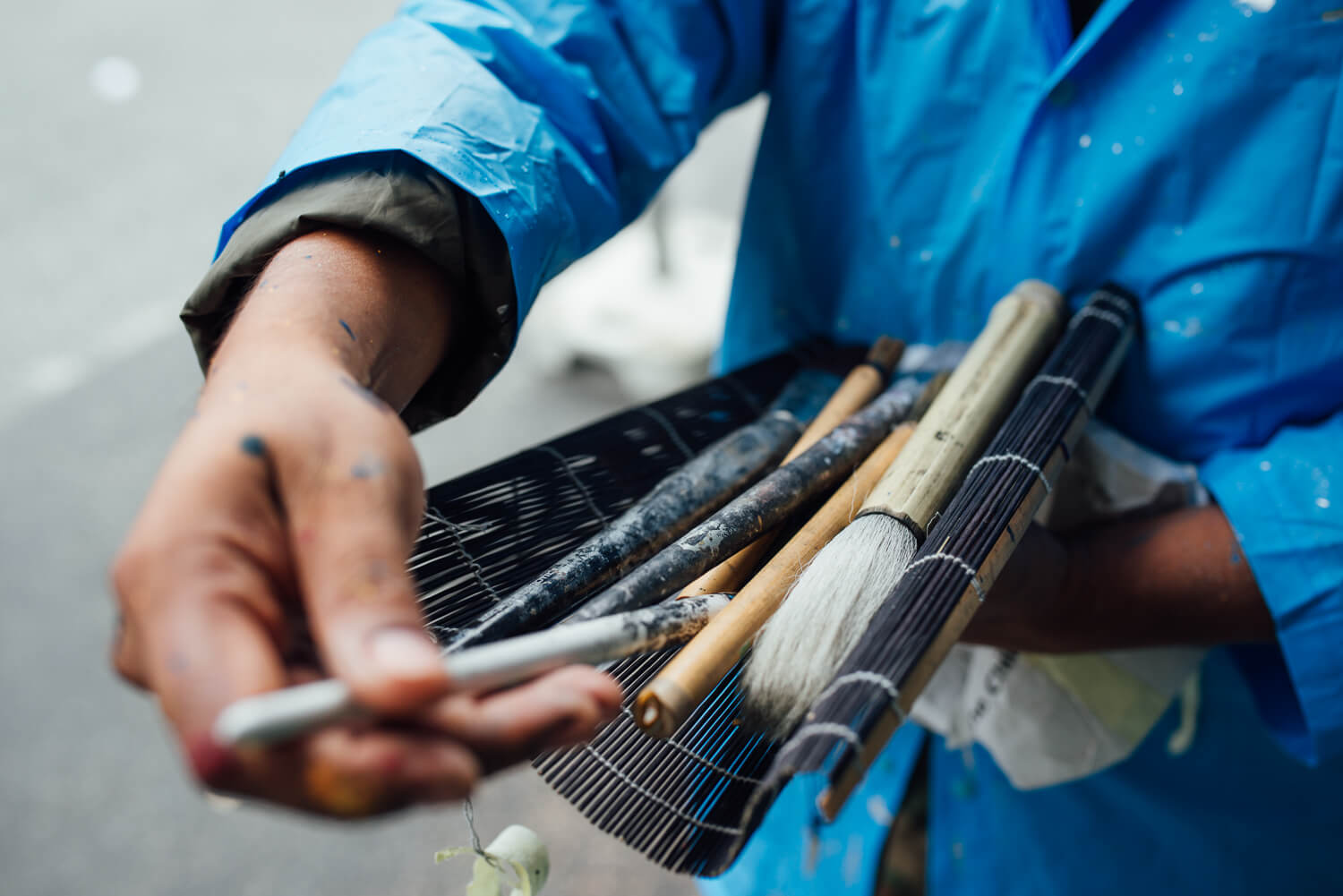 The names are painted in the artist’s trademark calligraphic style, which combines Japanese calligraphy with pre-phonetic Mexican notation.
