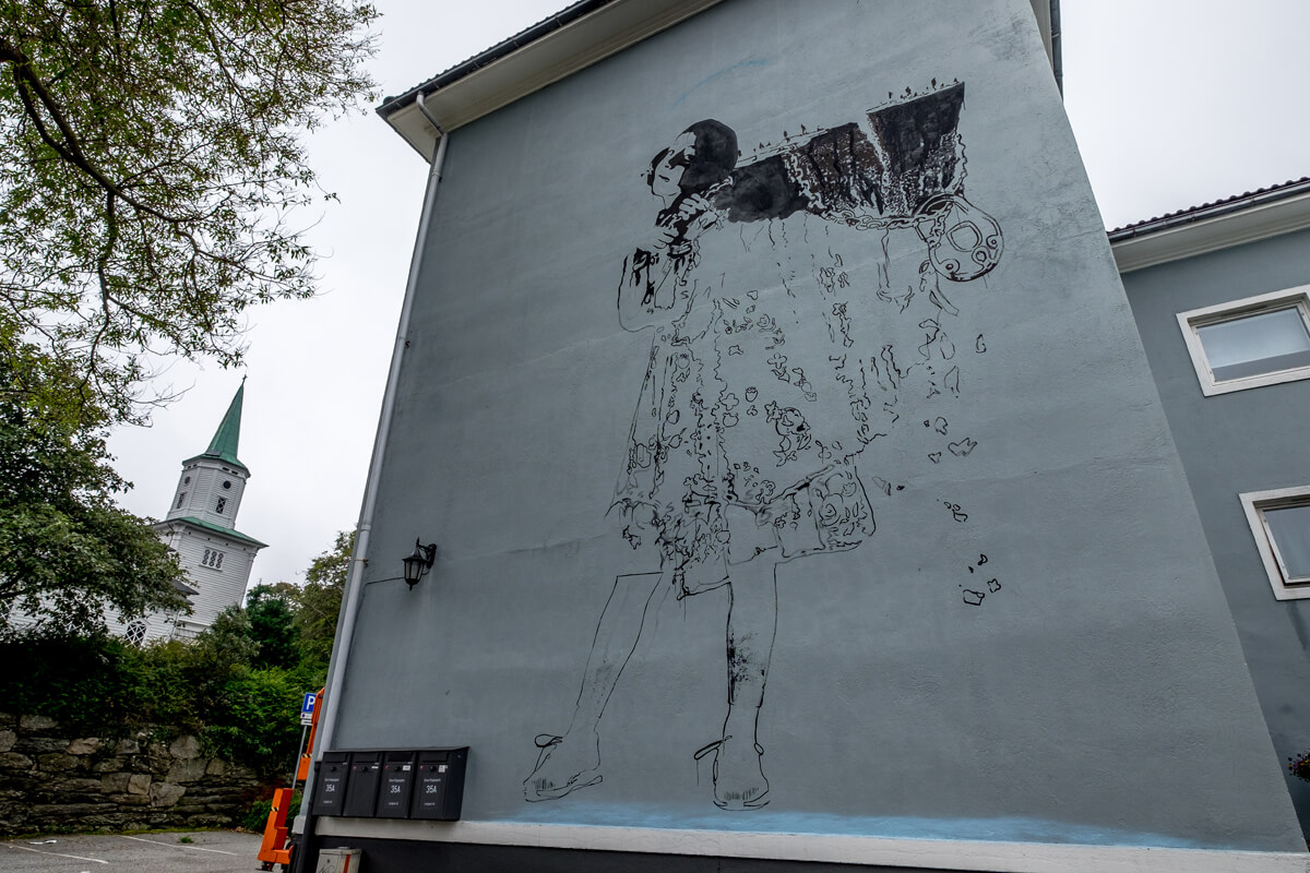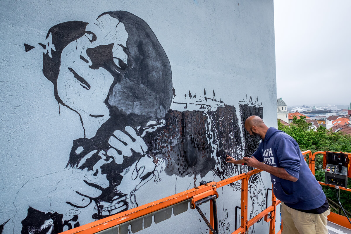 NIMI is an architect and street artist who likes to experiment with a variety of techniques, mediums and creative processes in his finely detailed murals and paintings. This new landmark was created with the assistance of local artist RH74 and can be found at Store Skippersgate 35, 4013 Stavanger.