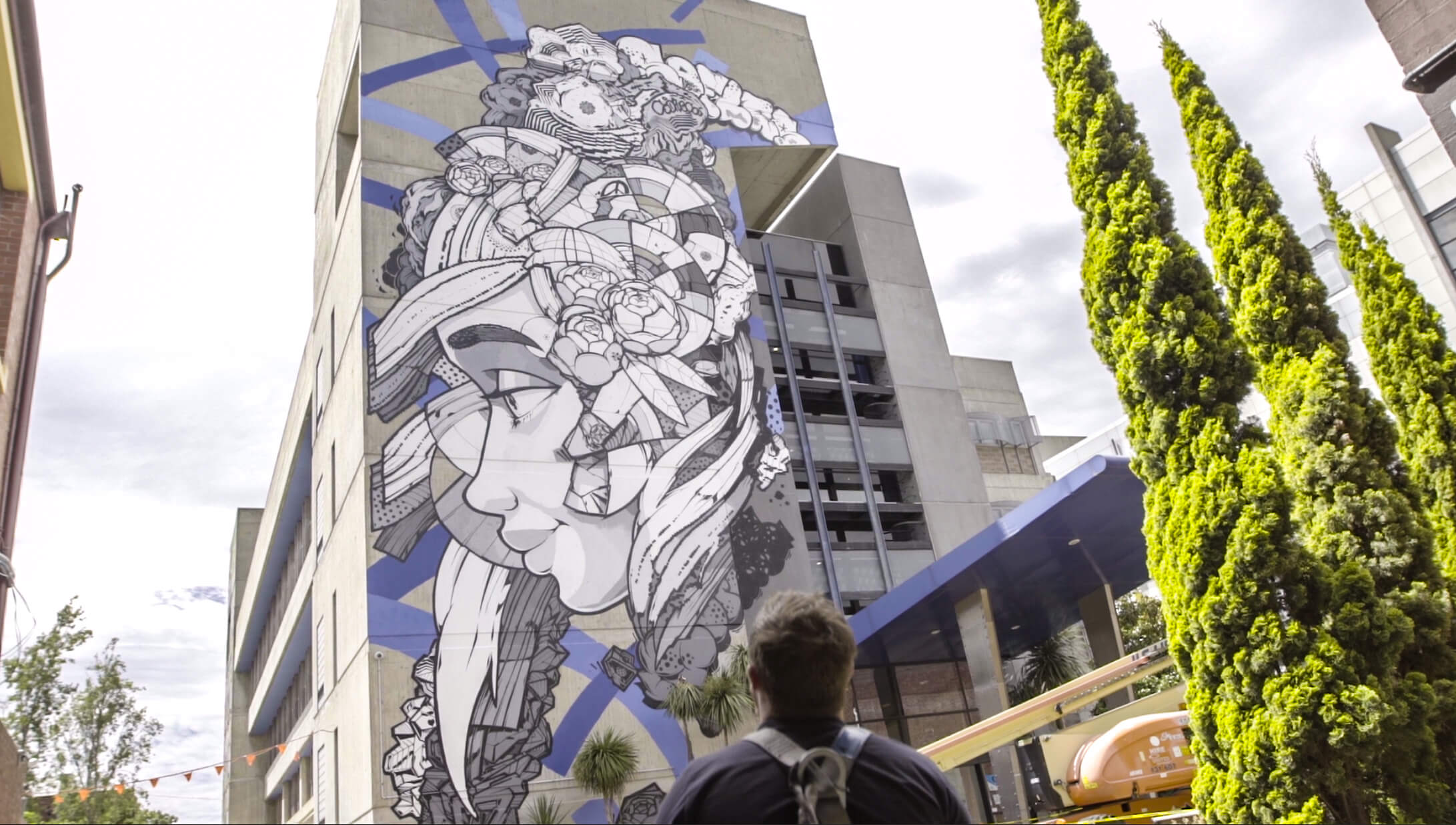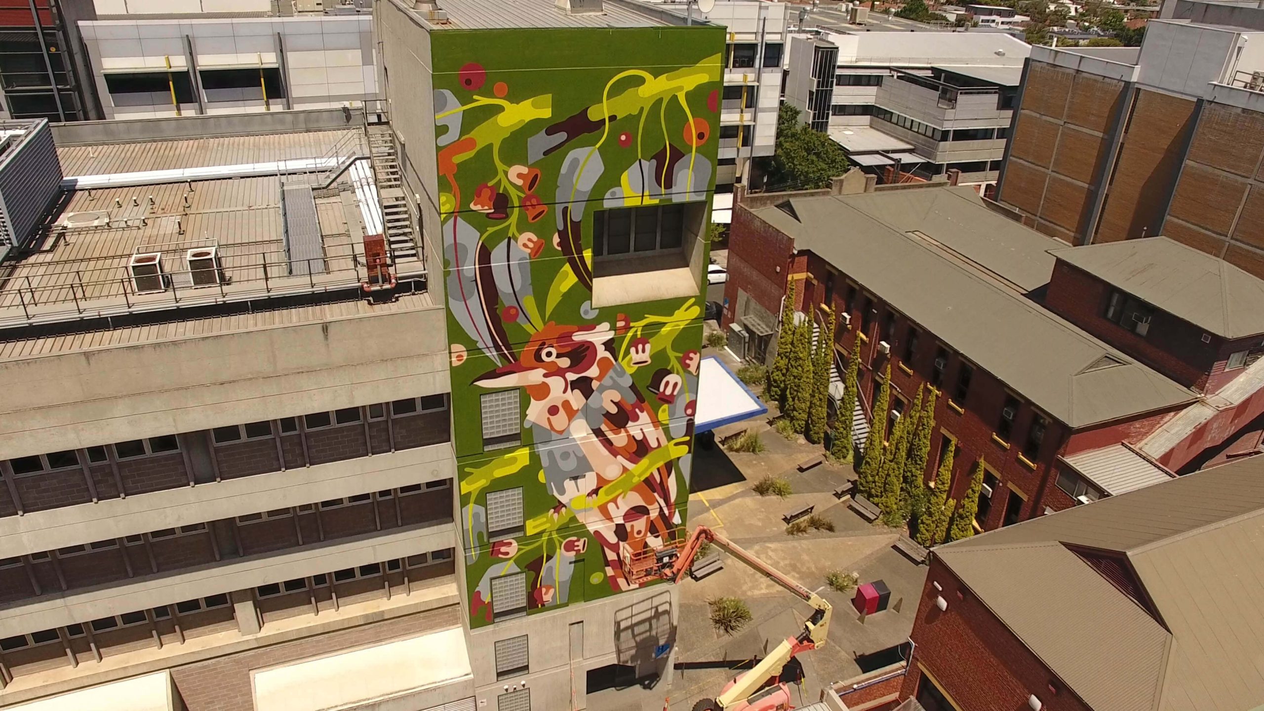 The seven-storey pieces, being created for the ‘Paint the Polytechnic’ project, were started in early December 2016, produced and curated by Juddy Roller with support from the City of Stonnington and Chapel Street Precinct to deepen Melbourne Polytechnic’s cultural legacy of public art with many new must-see art installations.