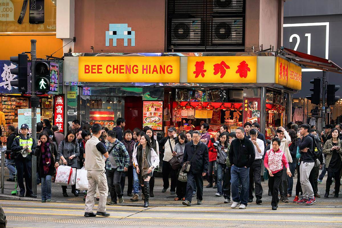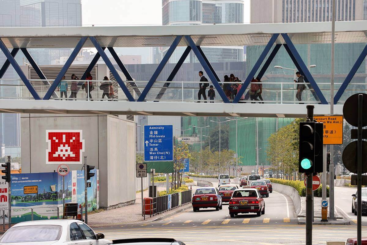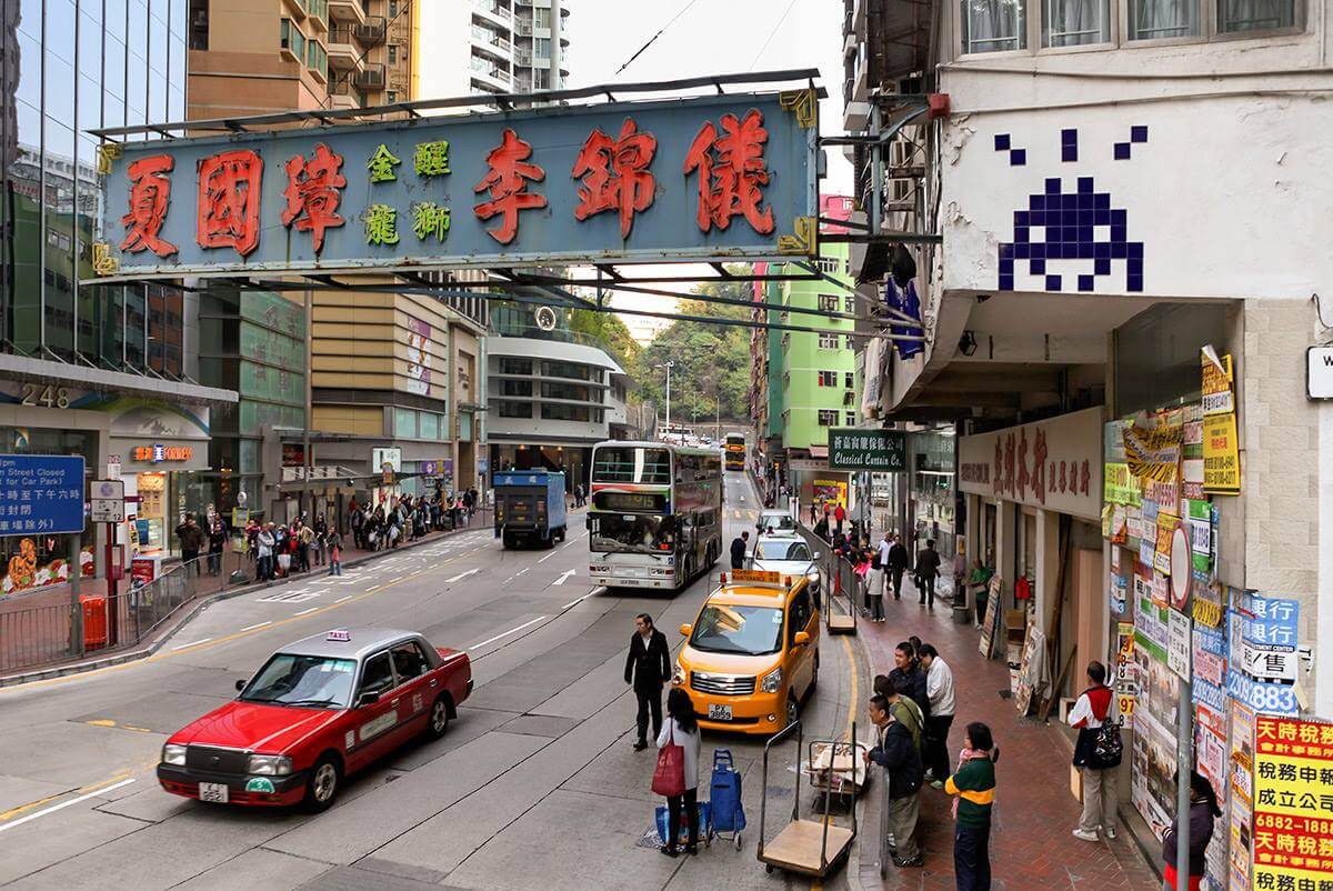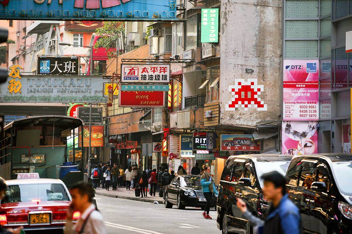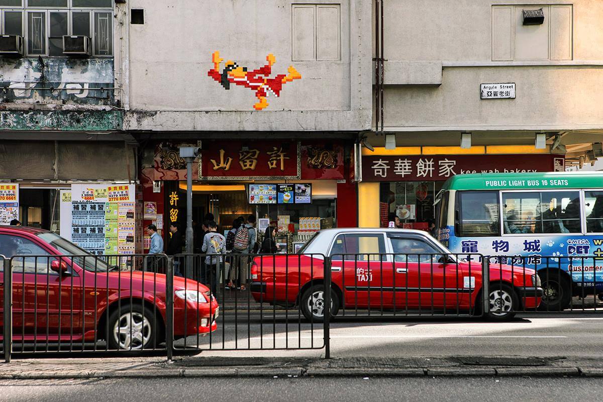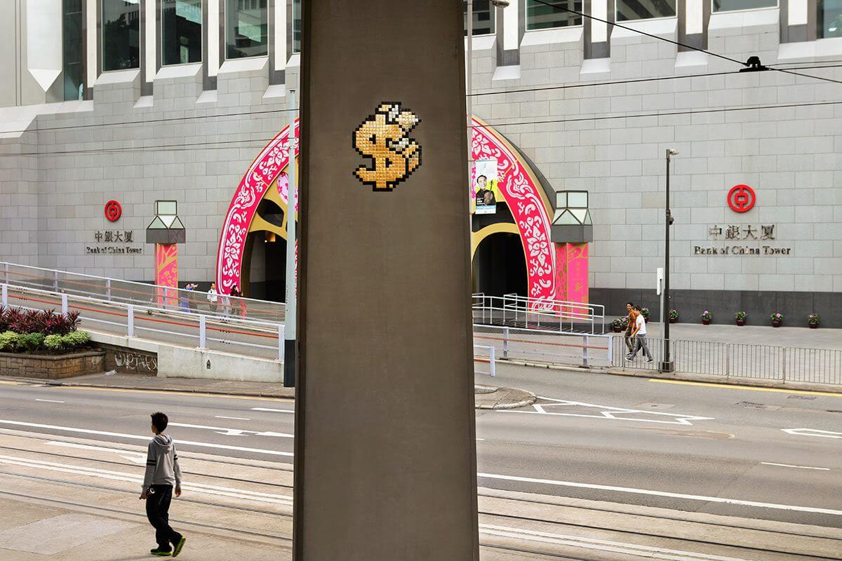 During his Hong Kong invasion in early 2014, Invader installed 48 works all over the city including images of video game characters, as well as Bruce Lee and Hong Kong Phooey, on public walls all round the city.