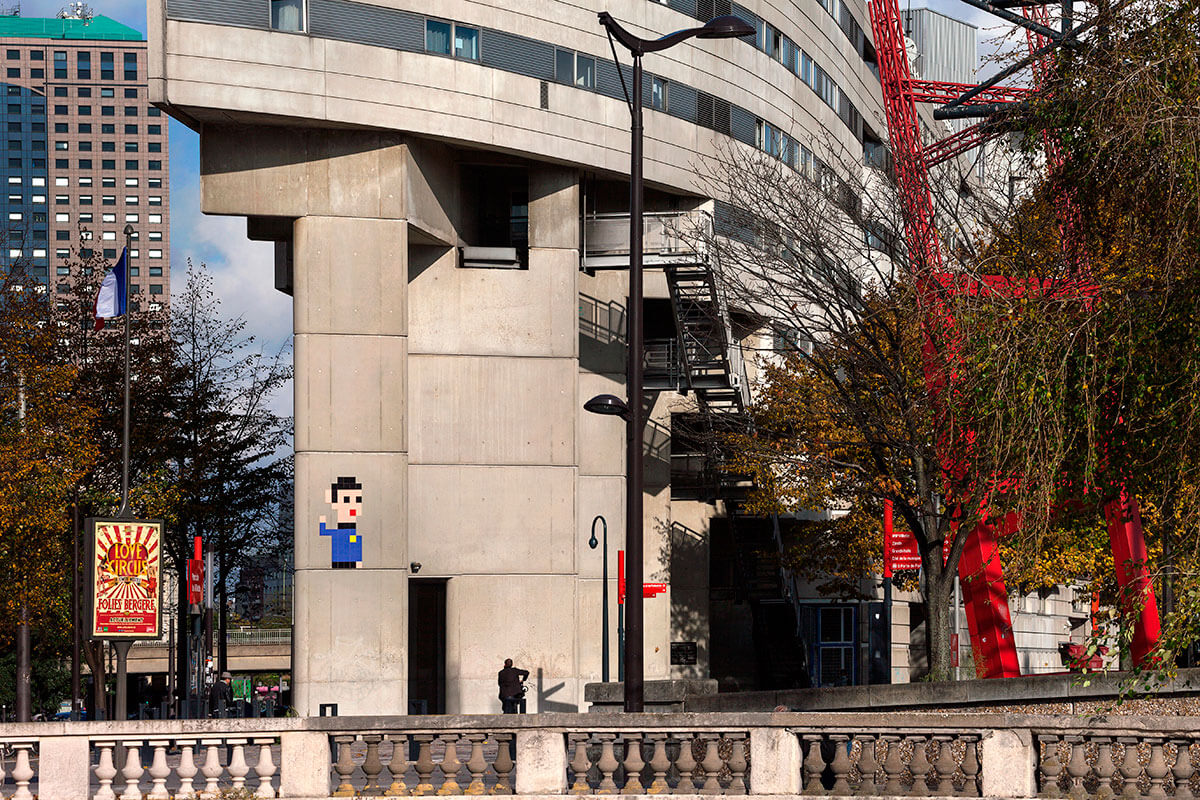 Space Invader is the pseudonym of a well-known French urban artist whose work is modelled on the crude pixellation of 1970s-1980s 8-bit video games. He took his name from the 1978 arcade game Space Invaders, and much of his work is composed of square ceramic tiles inspired by video game characters.