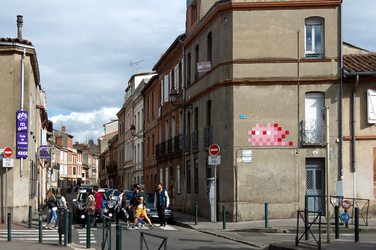 We last saw the French street artist Invading London with 12 new mosaics. He has returned to his home country of France where he has completed the first invasion wave of Toulouse with ten mosaics made from the colour pink!