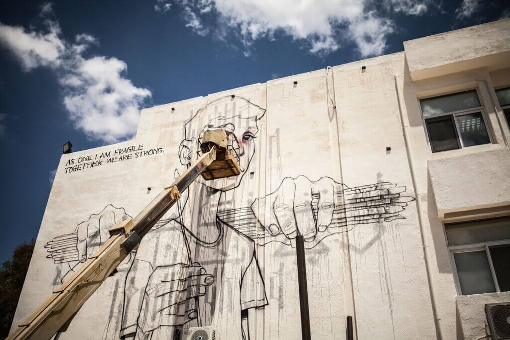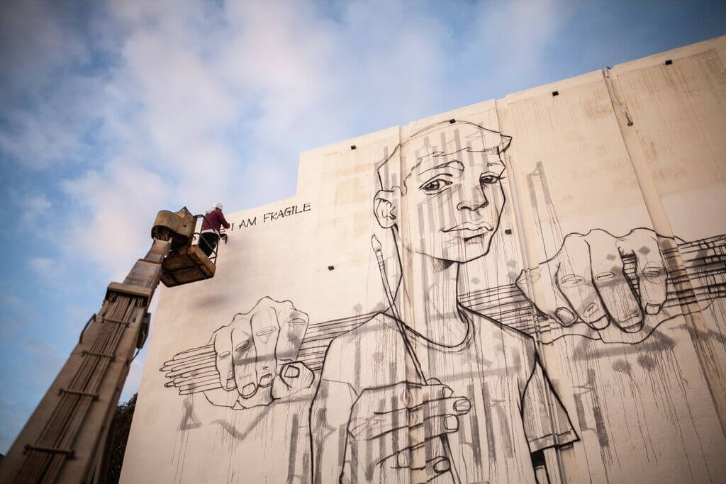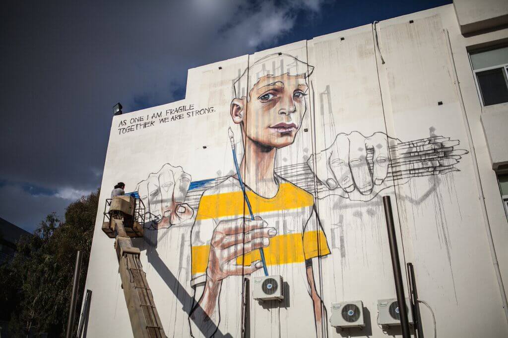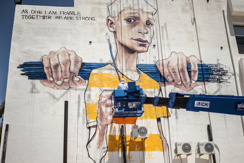 The phrase, “As one I am fragile, Together we are strong”, was added to the top left corner as a reminder that the refugee crisis is a global problem and can only be solved if the world stands together.