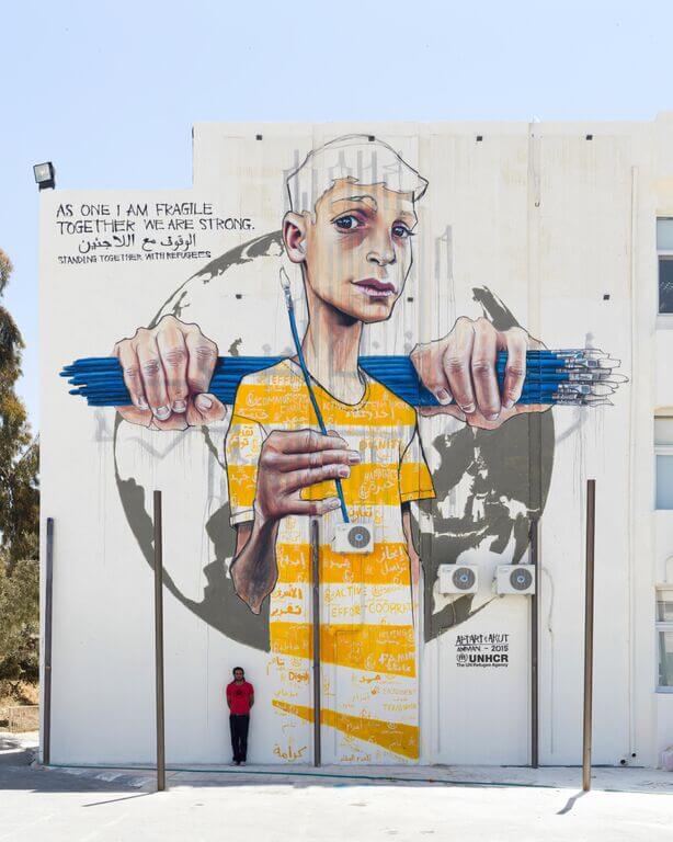 51 MILLION people have been forced to leave their homes worldwide. In the Middle East and North Africa region, many find refuge in Jordan. To commemorate the struggle and strength of refugees, Jordanian and international Artists, Akut of Herakut and Suhaib Attar joined forces with a group of Somali, Sudanese, Syrian and Iraqi children to paint the United Nations High Commissioner for Refugees UNHCR registration centre and headquarters in Amman, Jordan. UNHCR implemented the project along with Awareness & Prevention Through Art aptART.