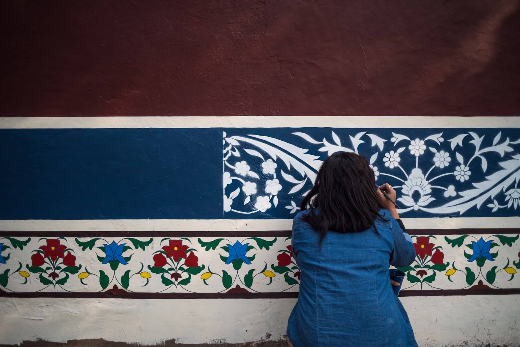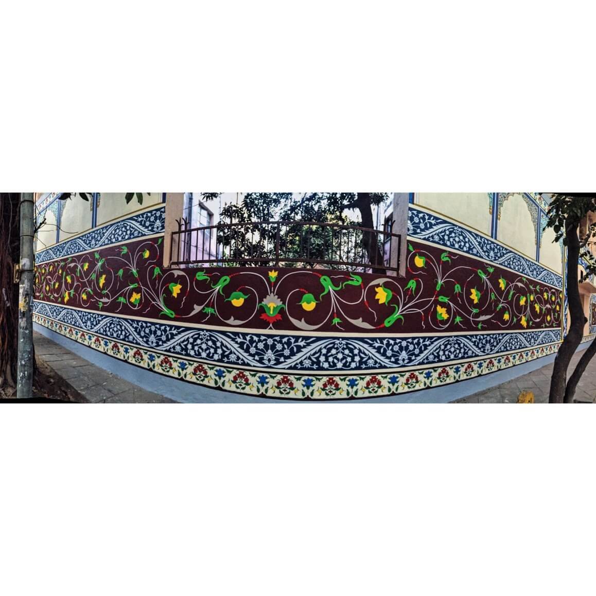Shekhawati painting (miniature art) by Mahendra Pawar and his team from Samode, Rajasthan. This wall is in continuation of St+art India Foundation’s endeavour of being inclusive of indigenous art forms along with international street artists to create India’s first Public Art District. This beautiful mural can be found opposite Khanna market in Lodhi Colony.