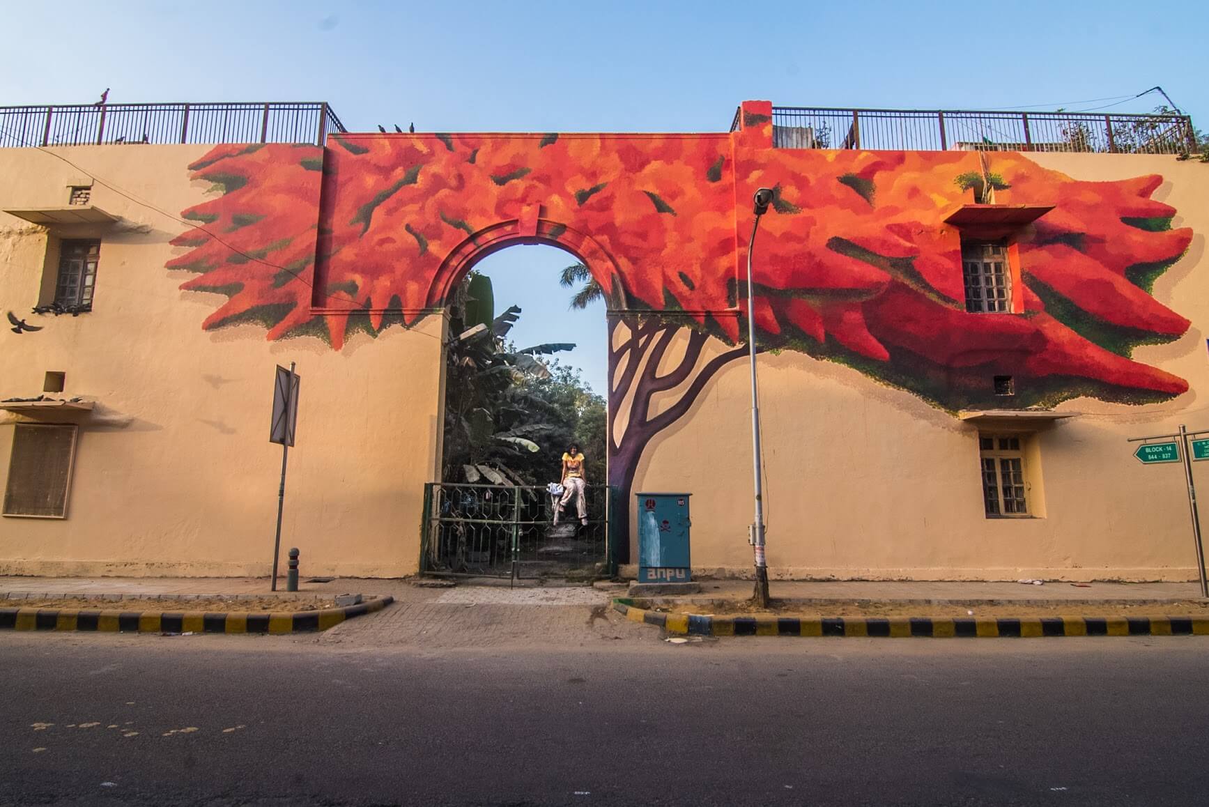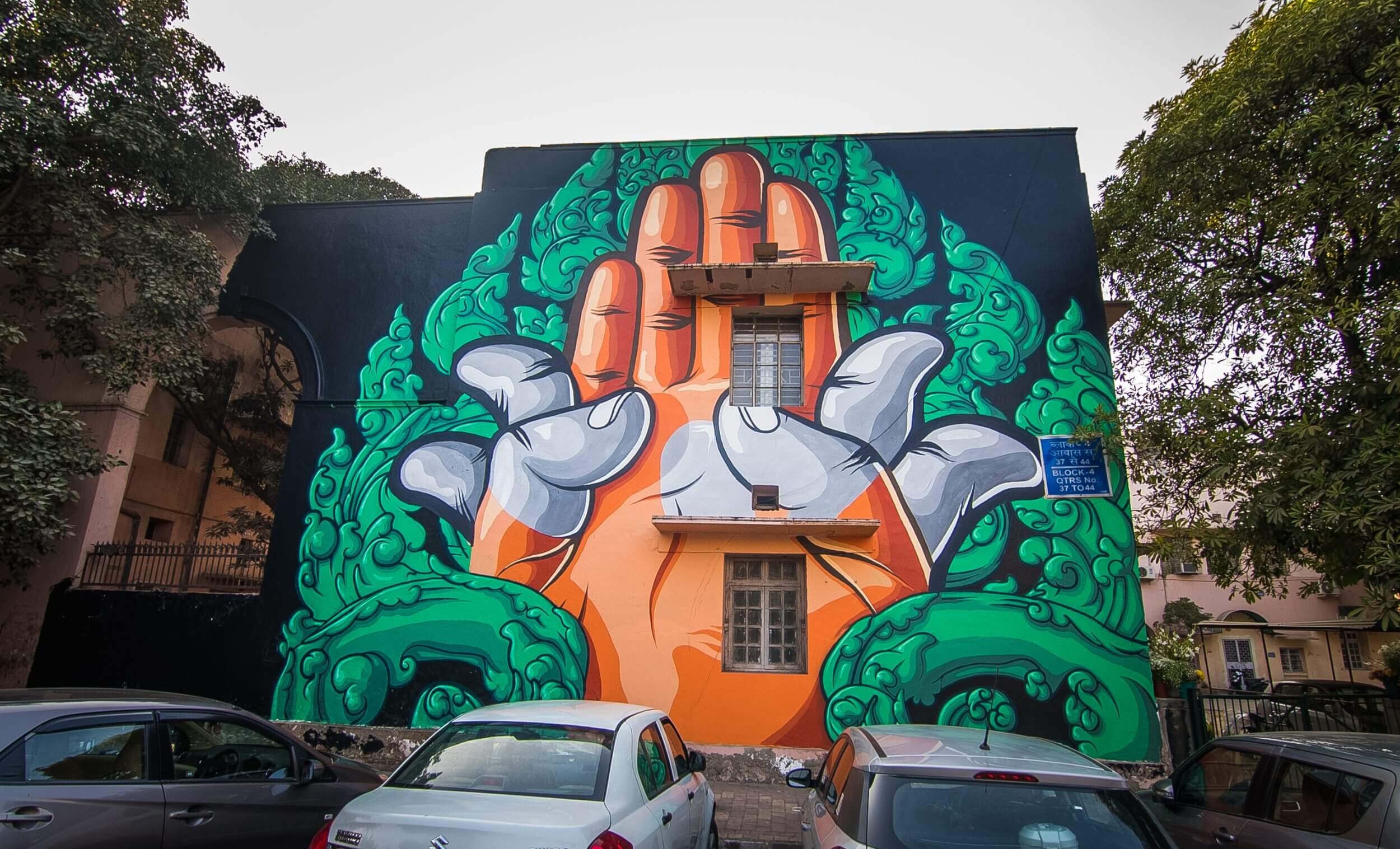 Anpu Varkey continues to push her boundaries as an artist by exploring newer forms in her work, like this mural in Lodhi Colony titled ‘Lava Tree’. From the deep recesses of a dreamscape, perpetuating the flow of lava, the tree posits to consume the entire building, shadowing the menace of our minds. Standing tall in Lodhi Art District, this mural can be found at block no. 14, Lodhi Colony.