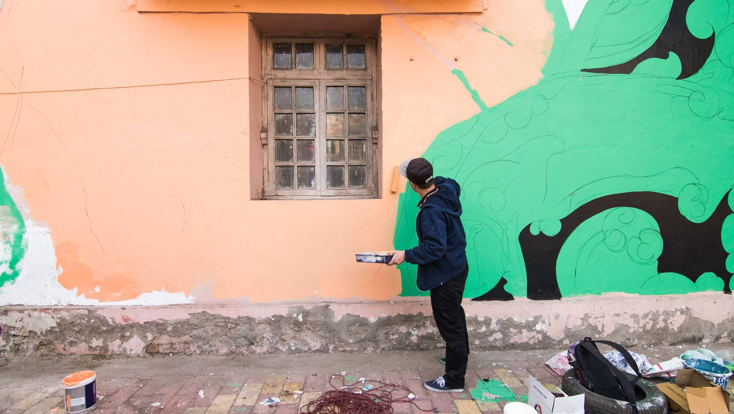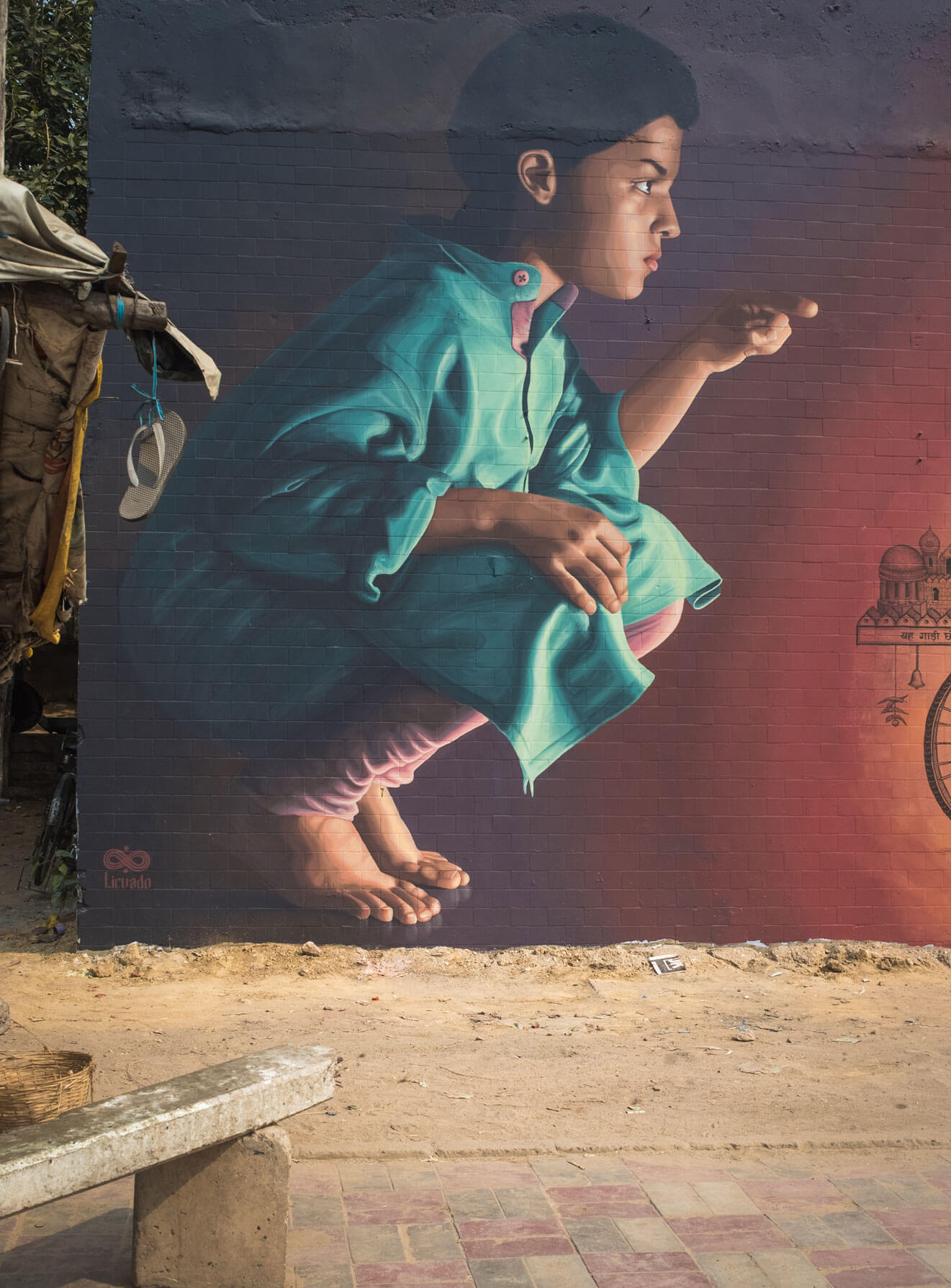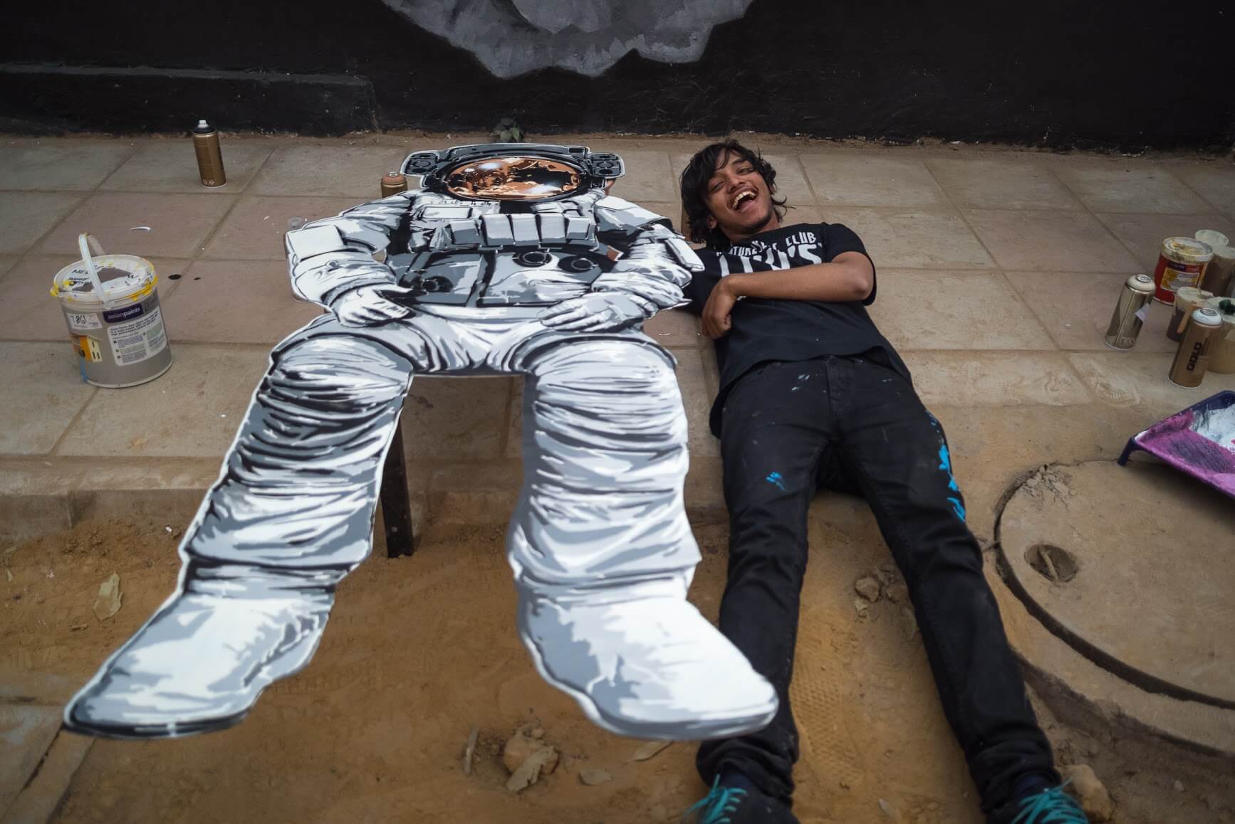Nevercrew is a Swiss duo whose work examines the human condition and especially the relationship between mankind and nature and of mankind and its nature. In Lodhi Colony they painted a colourful meteorite with an astronaut on top of the wall with colourful rays bursting to the ground. The astronaut atop the wall is a metaphor for someone who can see things from a different perspective, as a silent viewer of a larger picture. In this case, he is a witness to all the daily activities of Block 9 Lodhi colony.