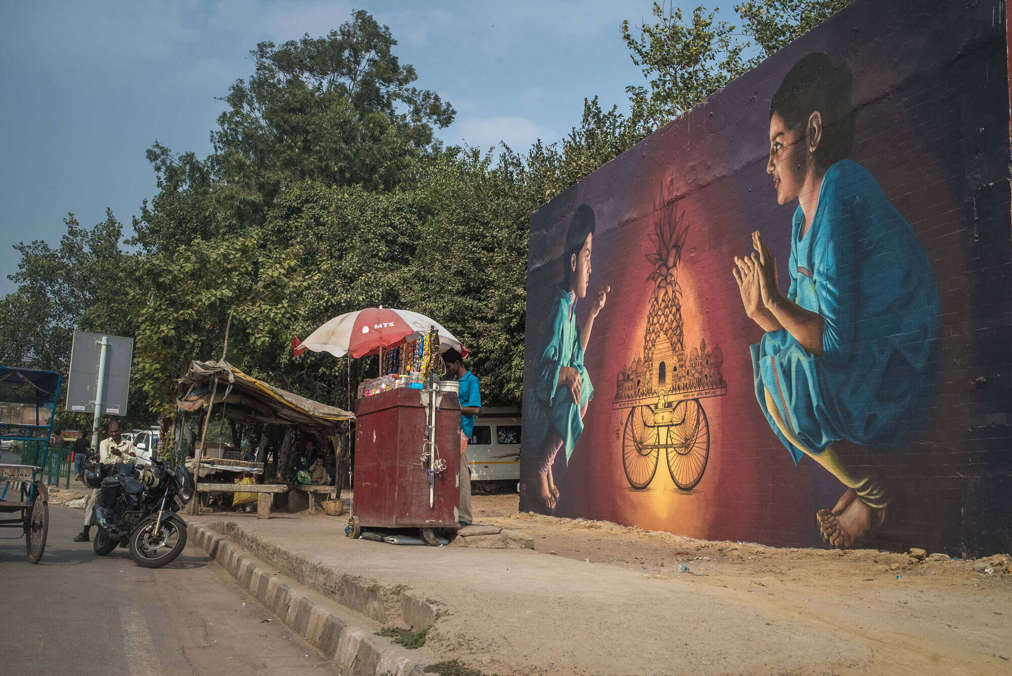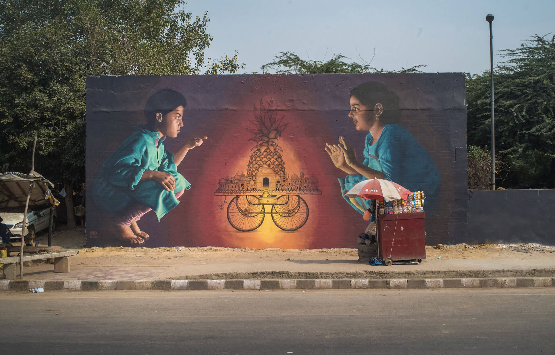 Colectivo Licuado: Fitz (Florence Duran) and Theic (Camilo Nuñez), teamed up AlfAlfa to paint this beautiful mural. The trio from Uruguay spent a few weeks in Delhi before painting this mural. The piece is inspired by several elements, characteristics and people they found interesting in the city. Having spent a few days painting their wall, they left a small token of gratitude for the tea vendor who has a stall right next to the wall. With the help of Painter Shabbu, a Sign Painter in Delhi, they wrote “This cart belongs to Chote Lal” on the cart painted on their mural in Hindi Typography.