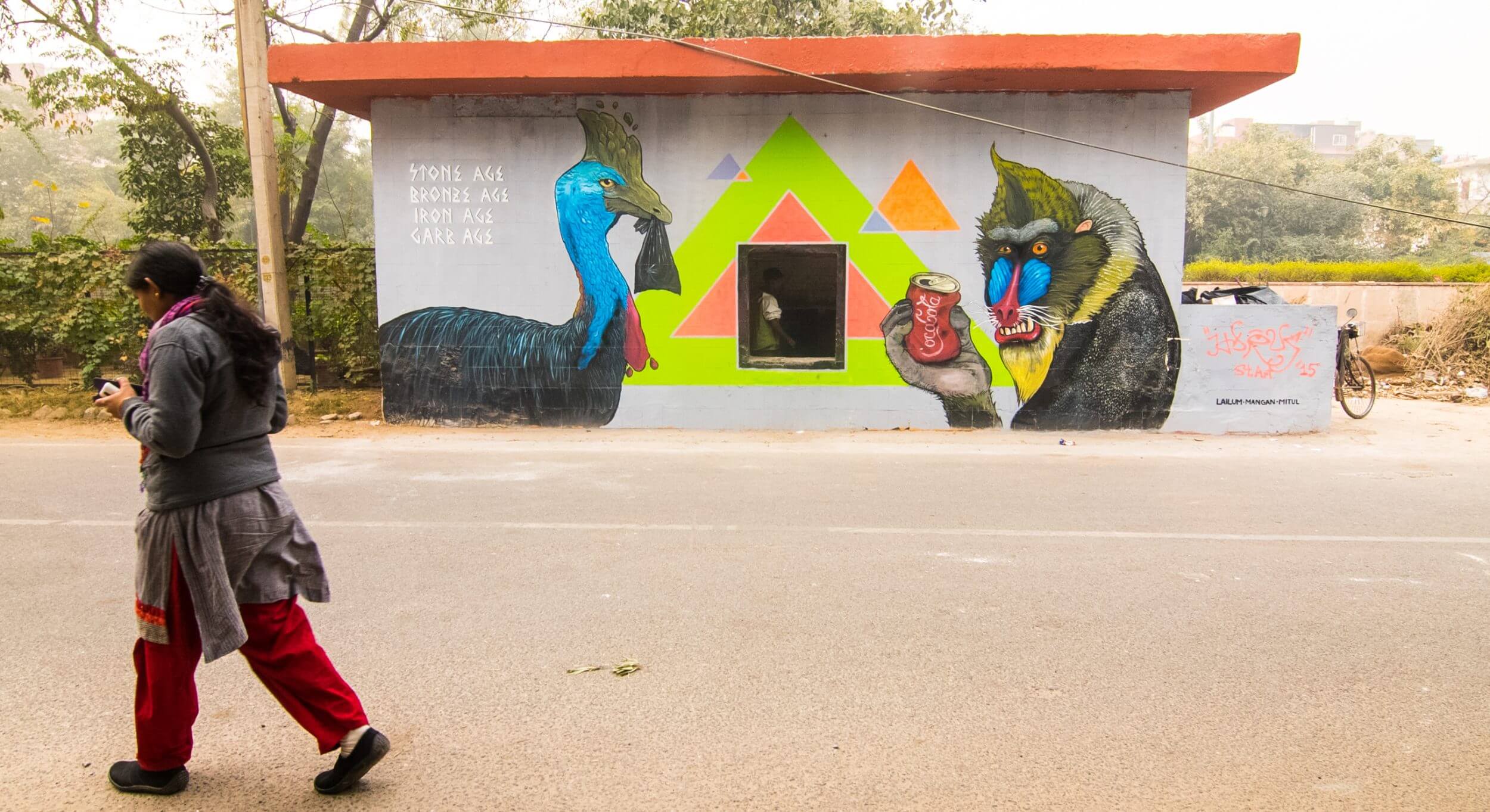 Horus, aka Arnab Sikder, street art work is mostly focused on surreal representations of wildlife. Arnab has previously helped St+art Delhi during 2014 with creating the longest mural in India at the Tihar Jail boundary wall. His mural, titled ‘GARB AGE’, is a subtle take on consumerism and its effect on the world around us. With growing consumption demands, the amount of pollution in the world is also increasing exponentially having an adverse effect on nature and animals that reside in it. Hence, Horus calls the age we live in ‘Garb Age’ in this piece he made at a Dustbin Collection Centre in Defence Colony.