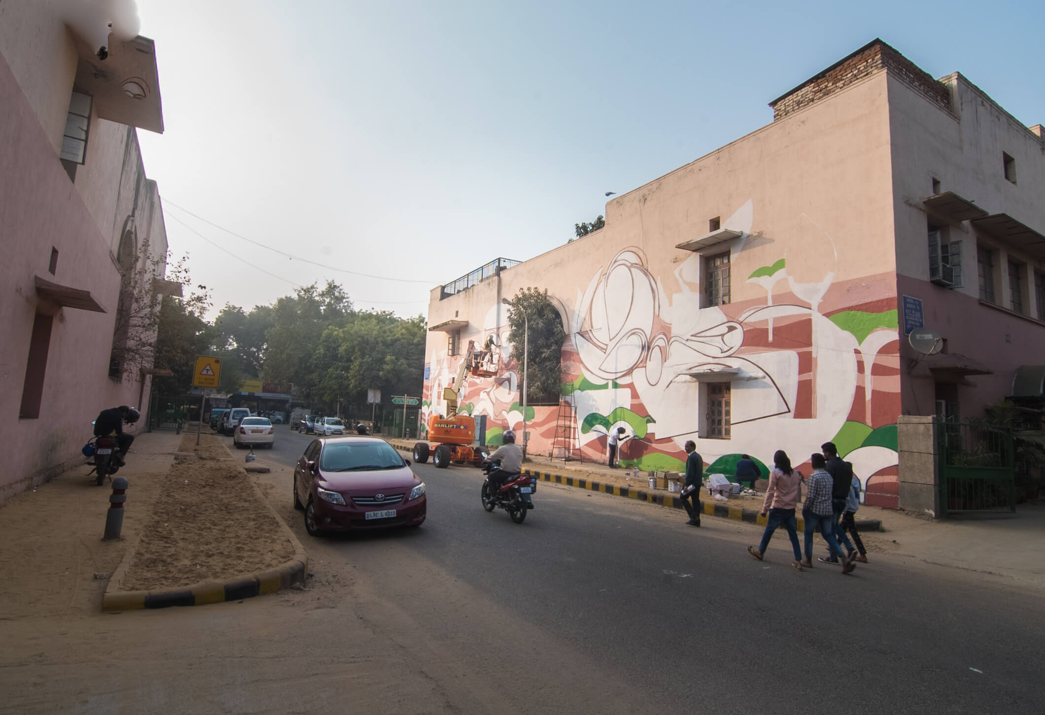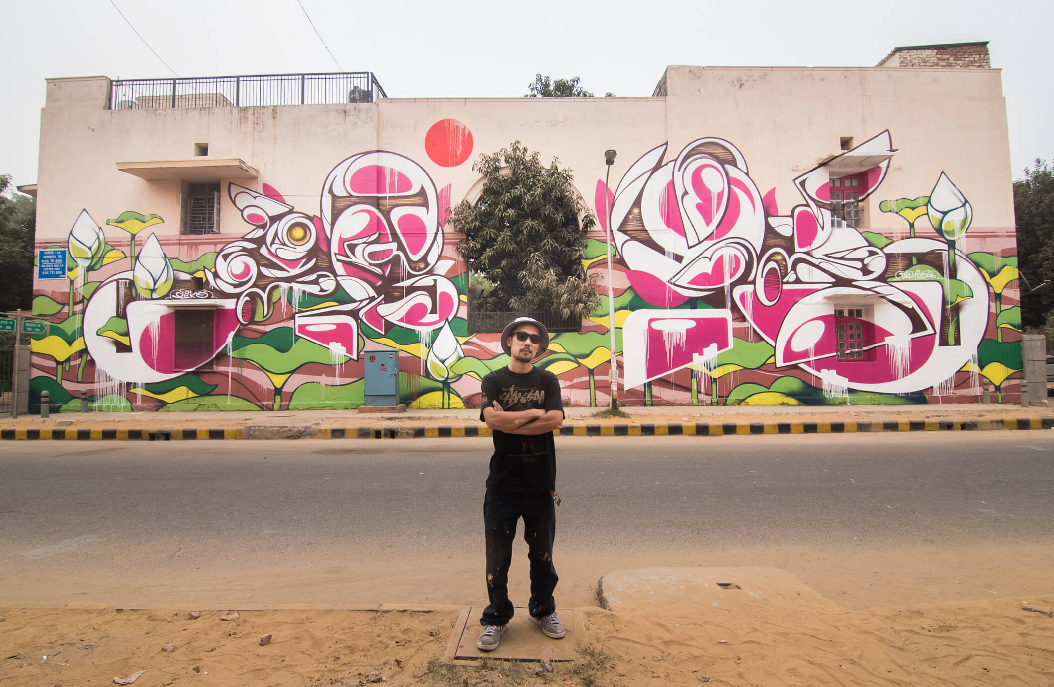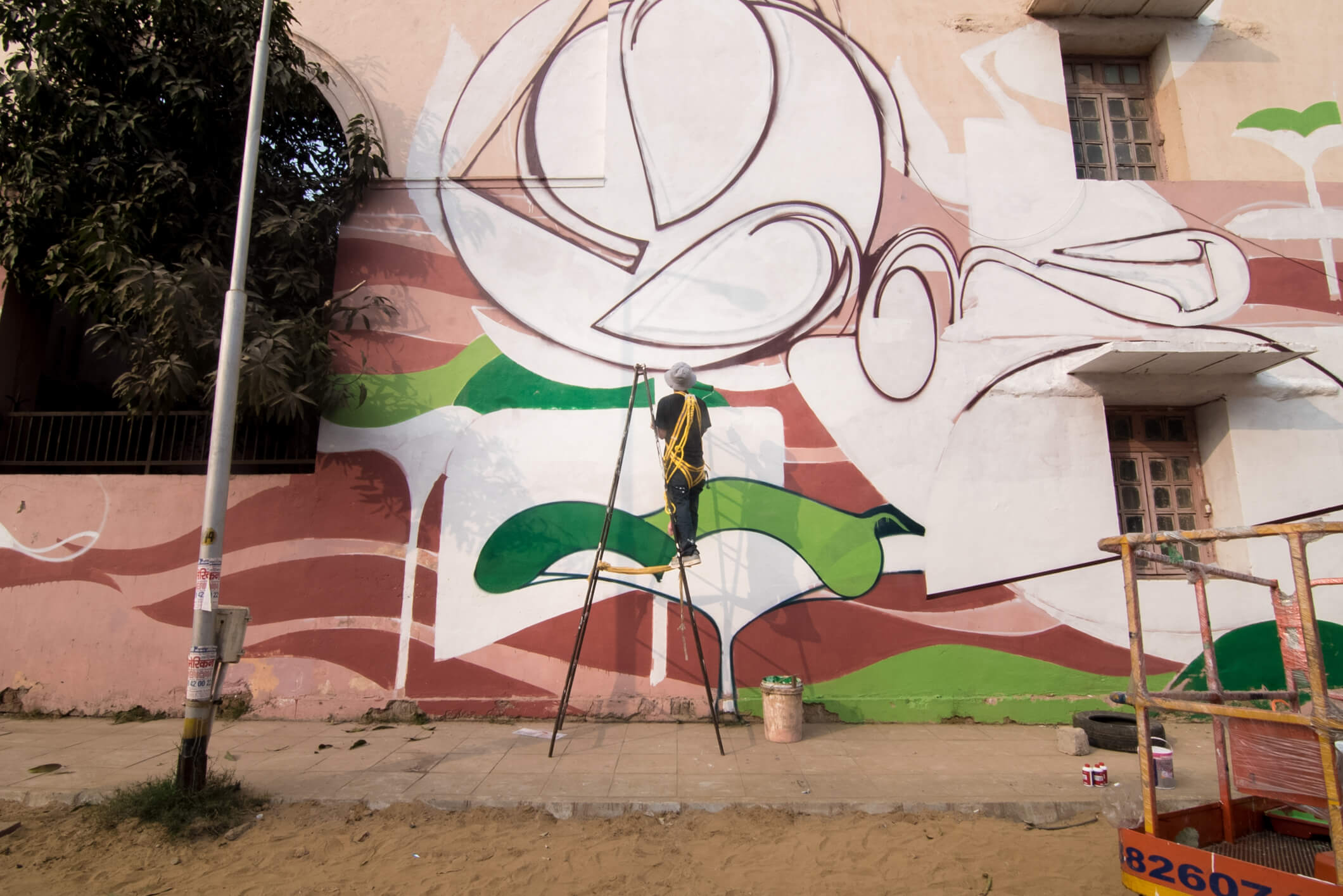 ‘The Lotus’ is by Japanese street artist Suiko ( 酔狂 ). Suiko focuses on expressive letters which hold circular shapes, bold lines, and vibrant color schemes. His style also resembles Chinese character designs. In this piece Suiko takes the national flower of India – the lotus and re-imagines it with his signature of curved lines and Japanese characters to create this mural for the Lodhi Art District. Being a pioneer of the graffiti movement in Japan, Suiko explores newer ways of writing his name which is a constant element in all his figurative compositions.
