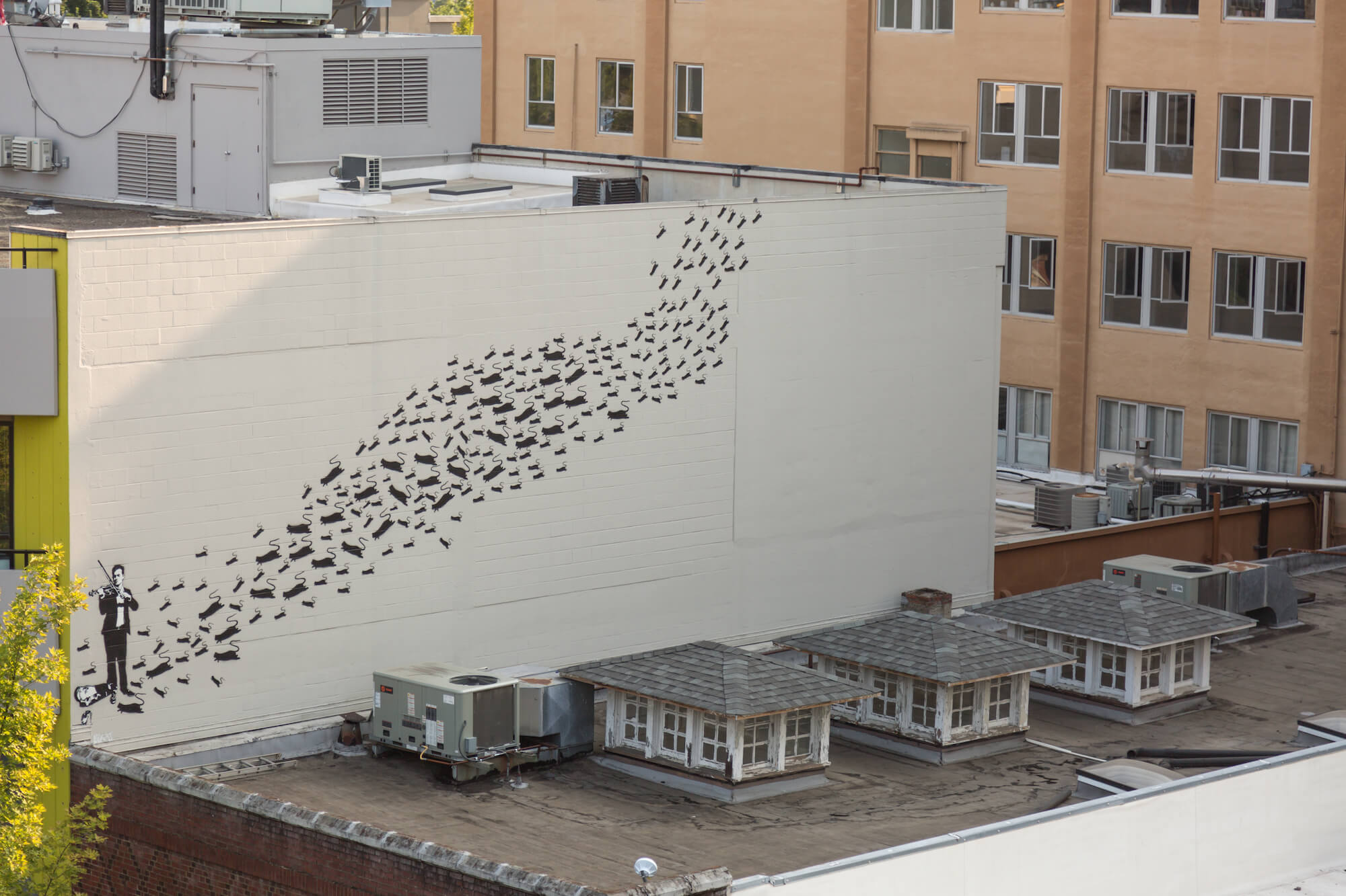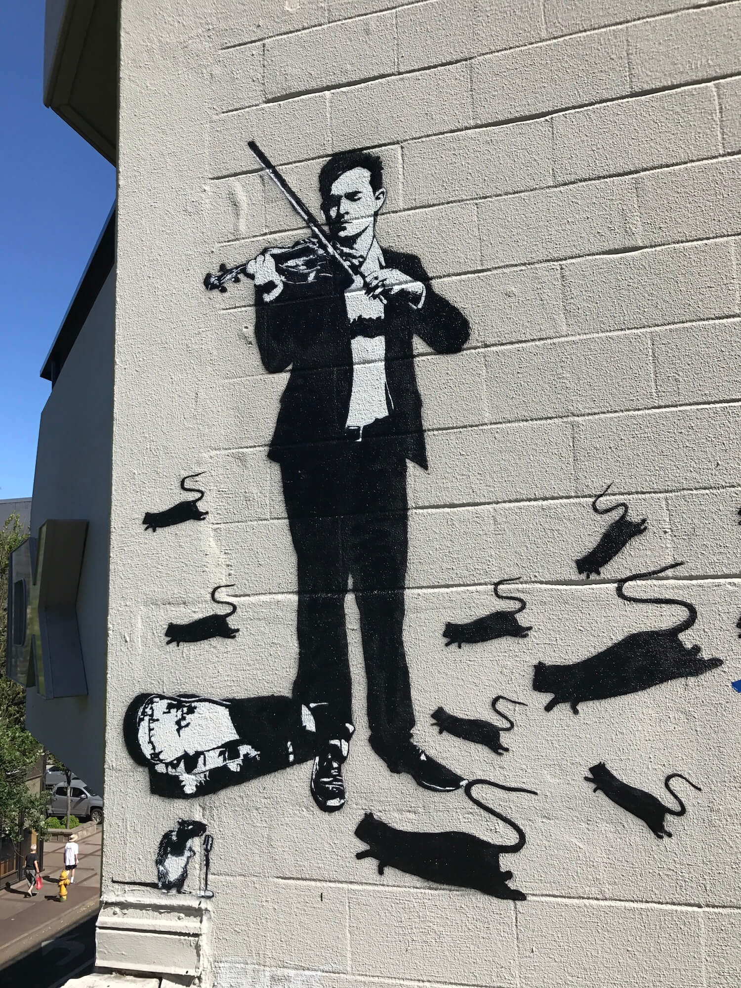 The prominent wall art created by the artist depicts The Pied Piper, who is seen luring all the rats of the city with his music. This fascinating artwork is situated at 100 E Broadway, Eugene, on the building of IDX Broker. The best vantage point for viewing this masterpiece is from the parking garage located at 10th and Oak. Notably, The Pied Piper prominently displays the face of the artist’s son, Alexander, and his signature crooning rat in the corner.