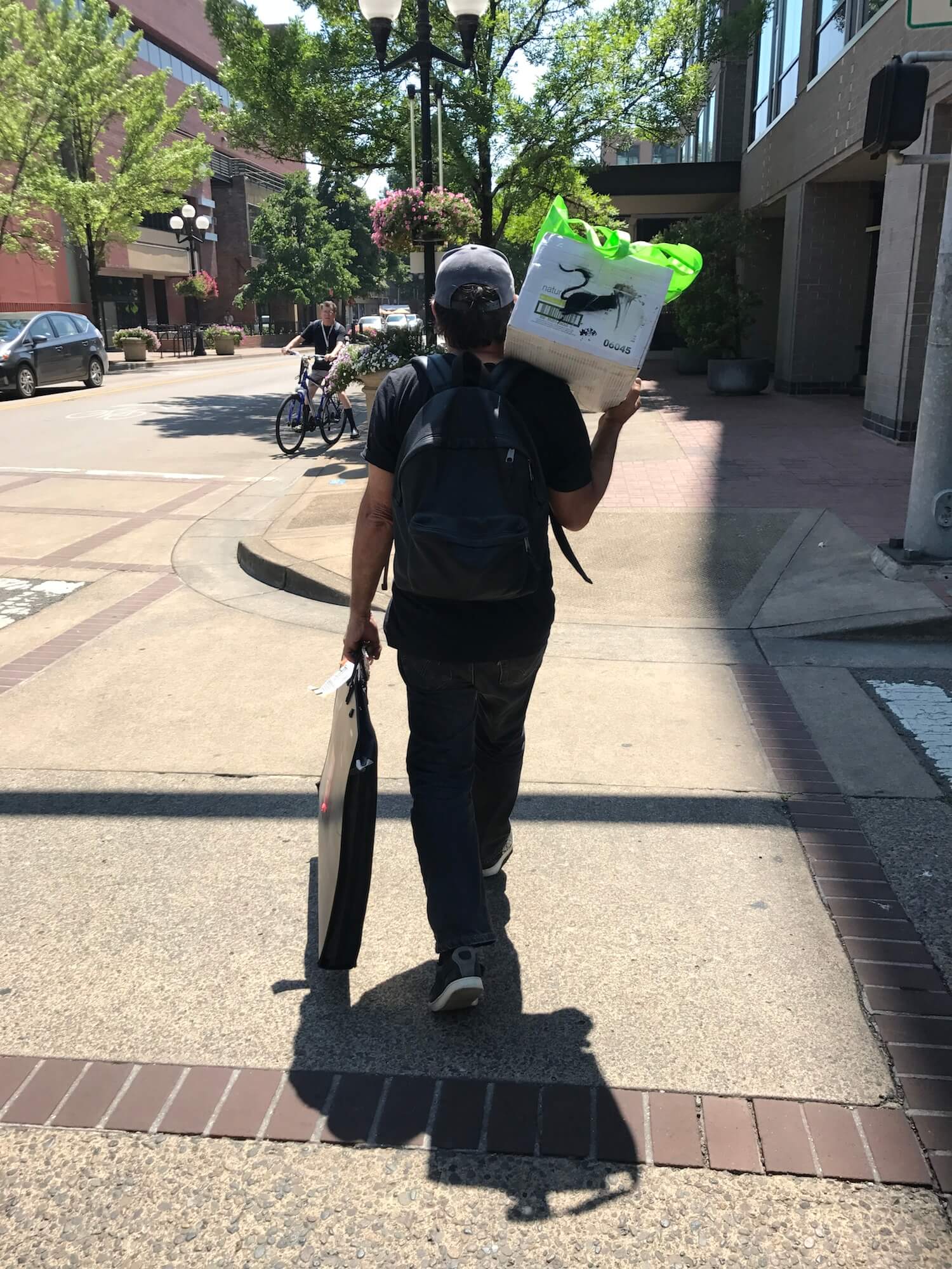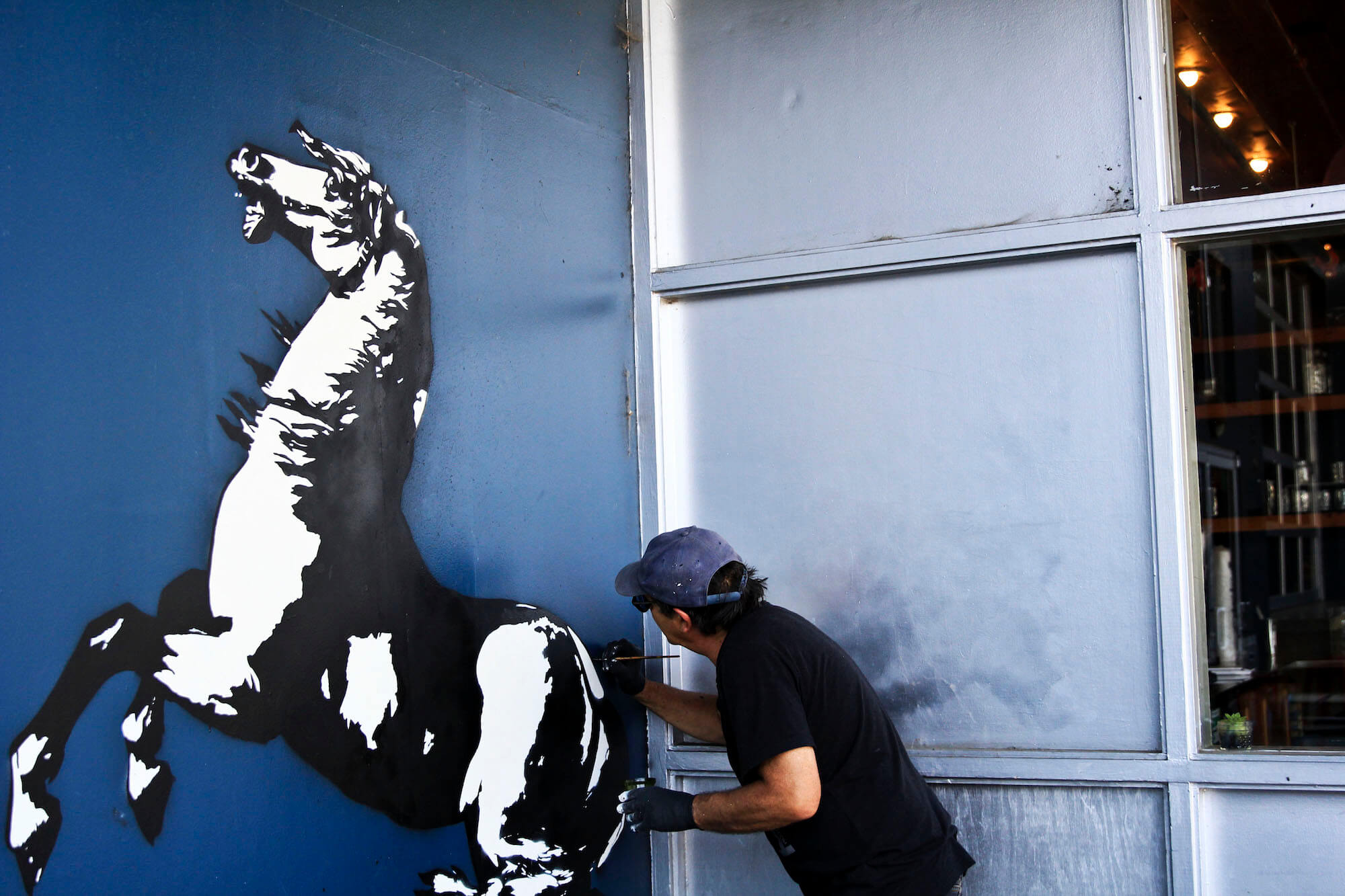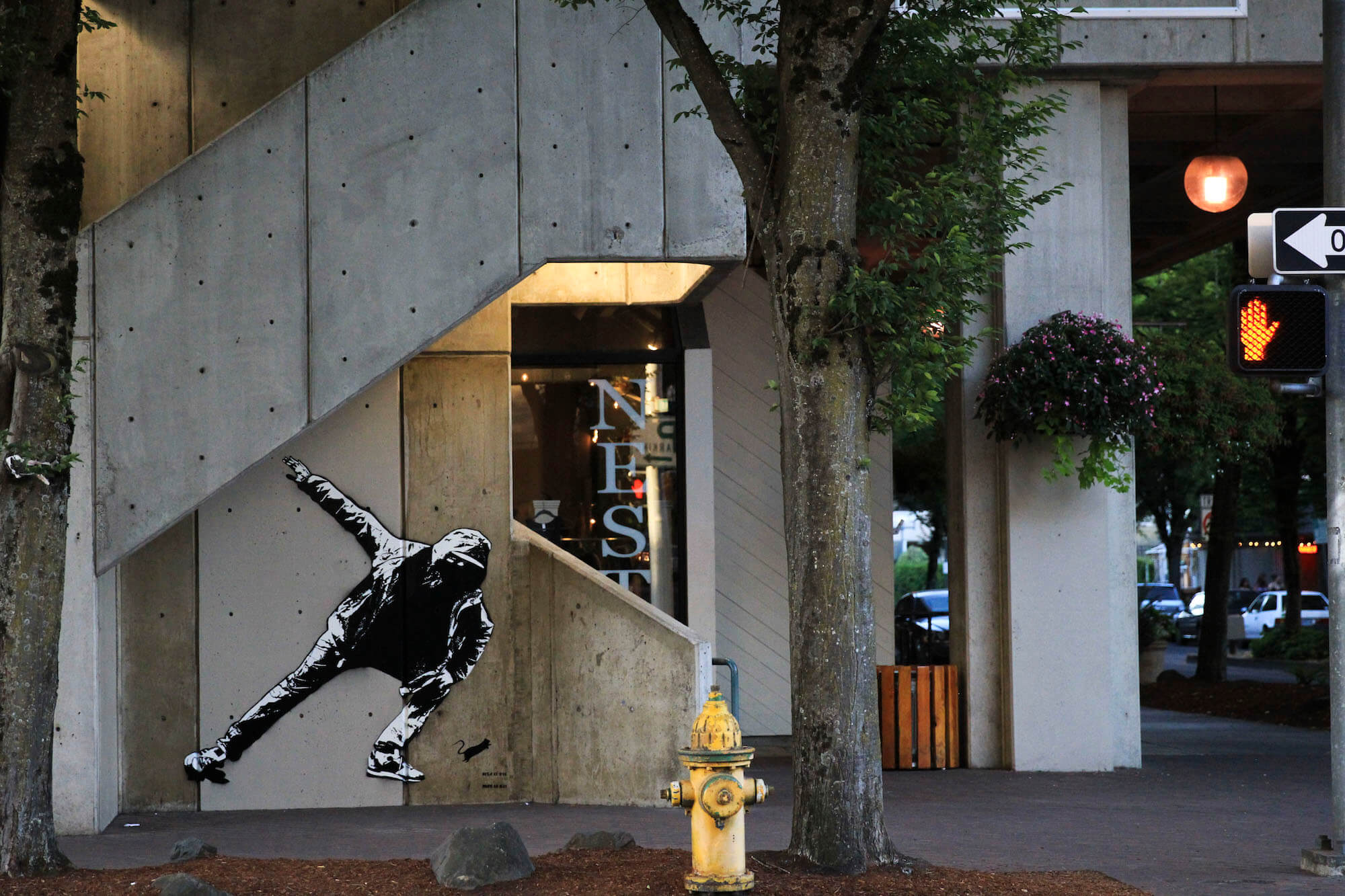 The artist embarked on a thorough exploration of Eugene’s streets and alleys in search of potential spots for his artistic creations. His signature and well-known black and white stencils can be found adorning both public and private spaces scattered throughout the city’s central area.