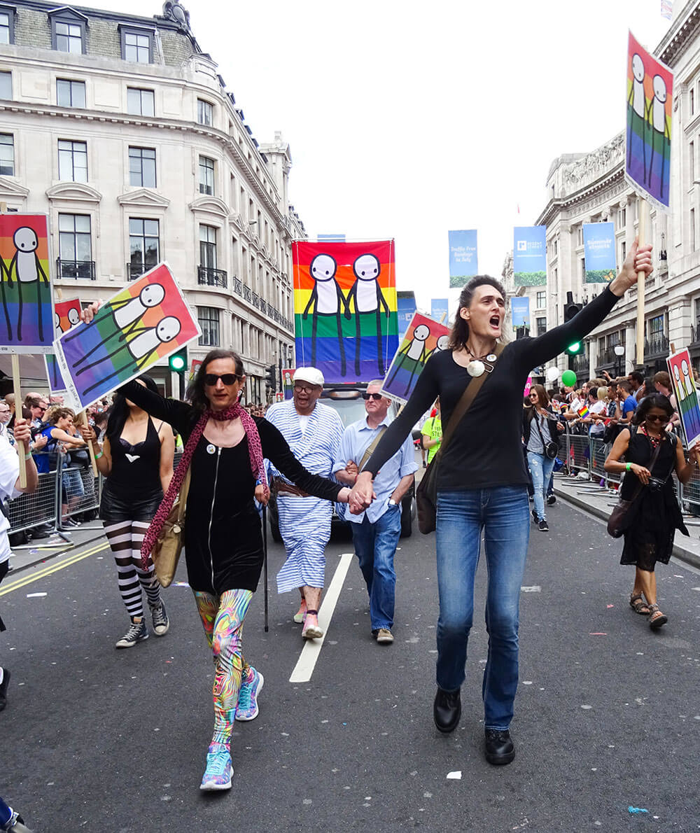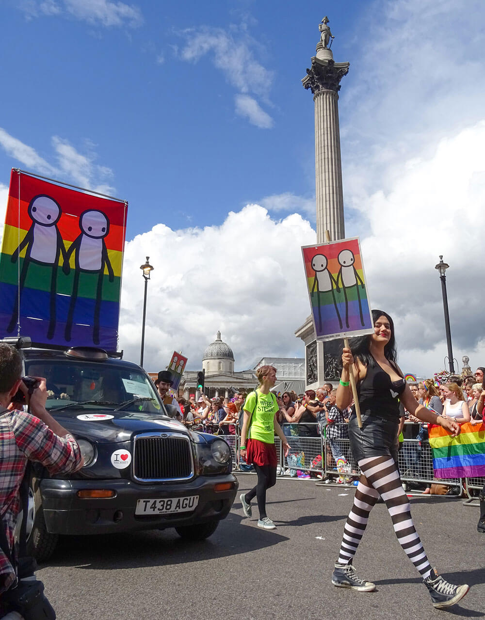Artist Stik created a two metre banner especially for the parade of two androgynous figures holding hands on a rainbow background strapped to the top of a specially adapted Hackney Carriage Taxi. The taxi followed the march from Portland Place to Whitehall, via Oxford Street, Regent Street, Piccadilly Circus, Lower Regent Street, Pall Mall and Trafalgar Square, between 1pm and 4.30pm.