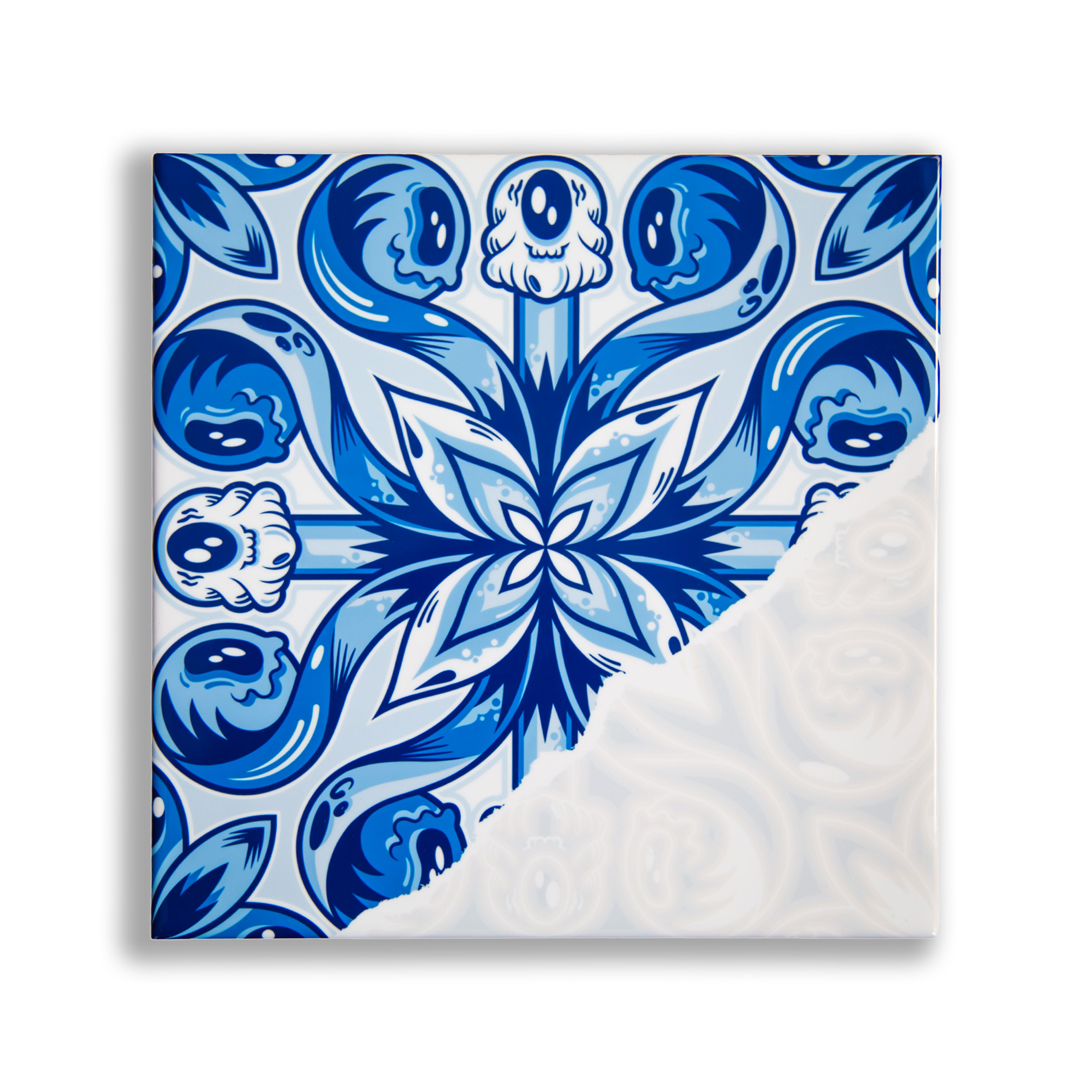 In AZ367 Flatness, Add Fuel reimagines the Portuguese azulejo, the iconic tin-glazed ceramic tile work synonymous with Iberian art and architecture, through a distinctly contemporary lens. Executed in gel and ink on ceramic, the work preserves the structural discipline and rhythmic symmetry of traditional azulejos while infusing them with the artist’s modern visual language of layered pattern, concealment, and play.
