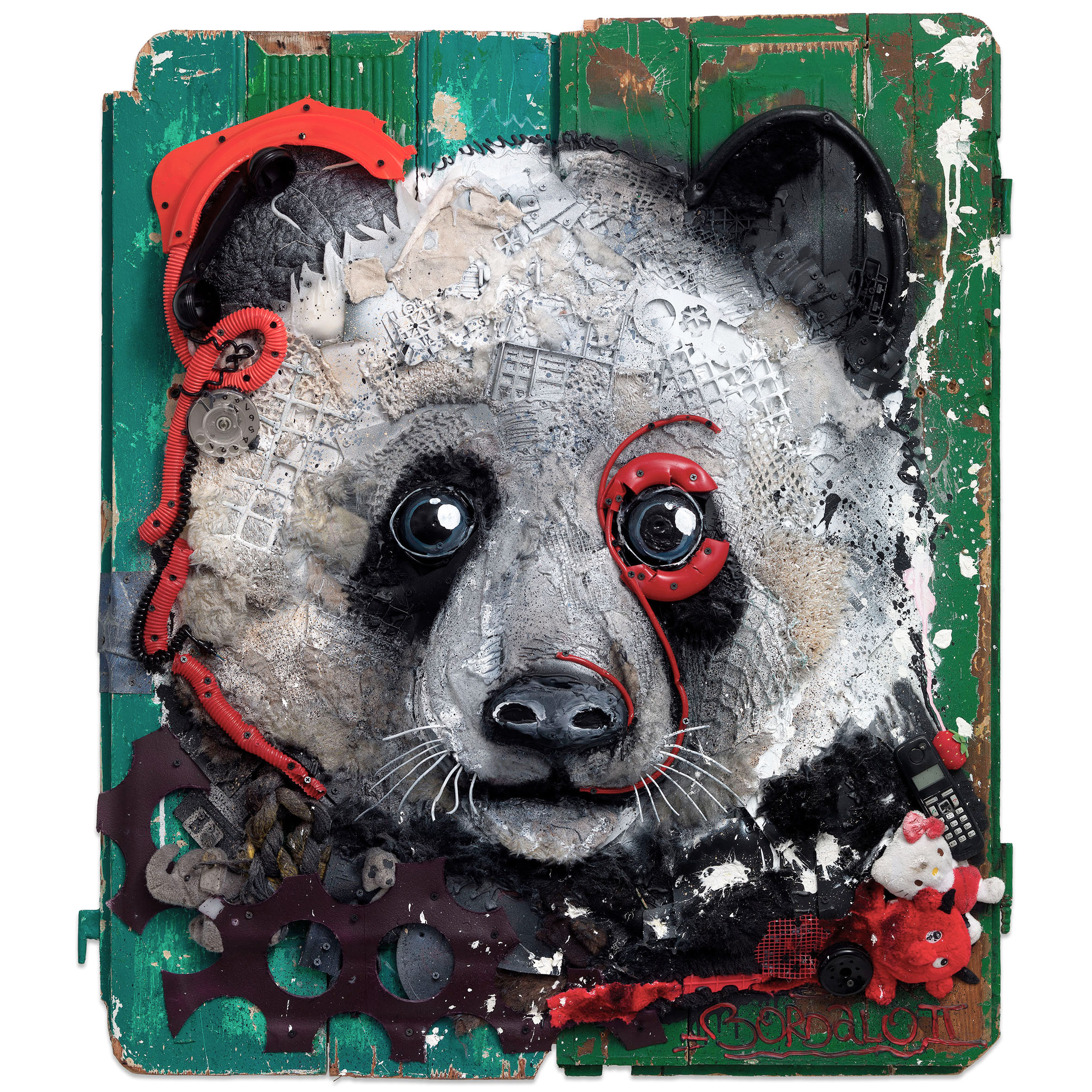 Bordalo II’s Neutral FX Panda is a striking piece from his iconic Trash Animals series, created entirely from discarded materials such as plastic toys, broken objects, and industrial waste.