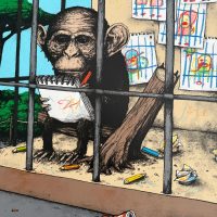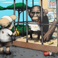 This satirical twist is a poignant commentary on the lack of human evolution and that the paintings ultimately reveal humans caged behind bars.