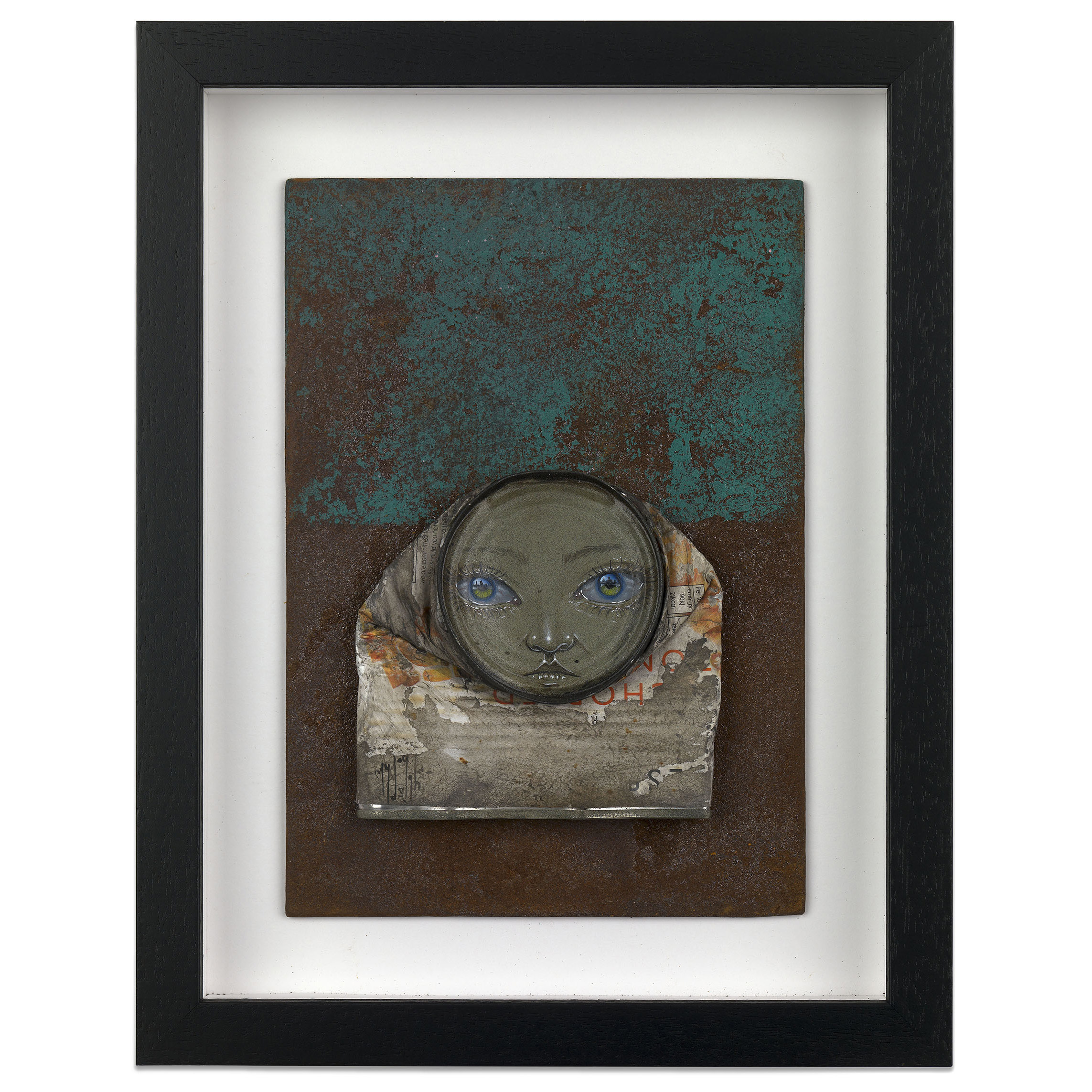 This work begins with a discarded can from the Essential range, found and repurposed by the artist. Its dents, folds and traces of use remain visible, preserving the object’s history of anonymity and disposal rather than concealing it. Within the circular opening of the crushed can, a painted face emerges. The figure’s green gaze meets the viewer directly, appearing both sheltered by the metal surface and quietly exposed. By intervening in a discarded object, My Dog Sighs shifts its meaning. What was once overlooked or cast aside becomes a singular presence, inviting reflection on value, attention and the fragile boundary between waste and worth.