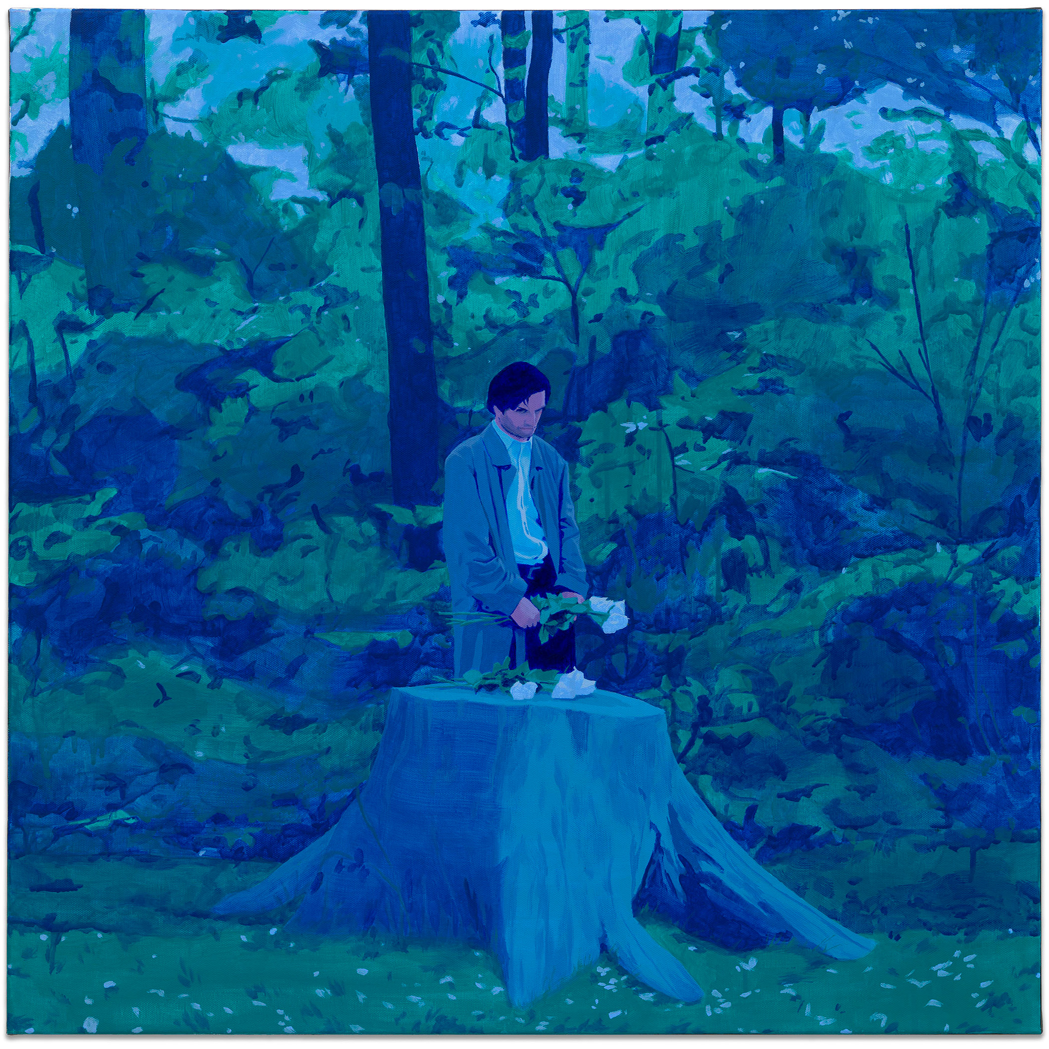 In the heart of a forest, a man stands before a cut tree stump—once a towering presence among the trees. He lays cut flowers upon its surface, a quiet act of mourning. Both the stump and the flowers serve as symbols of lives once vibrant, now silenced.