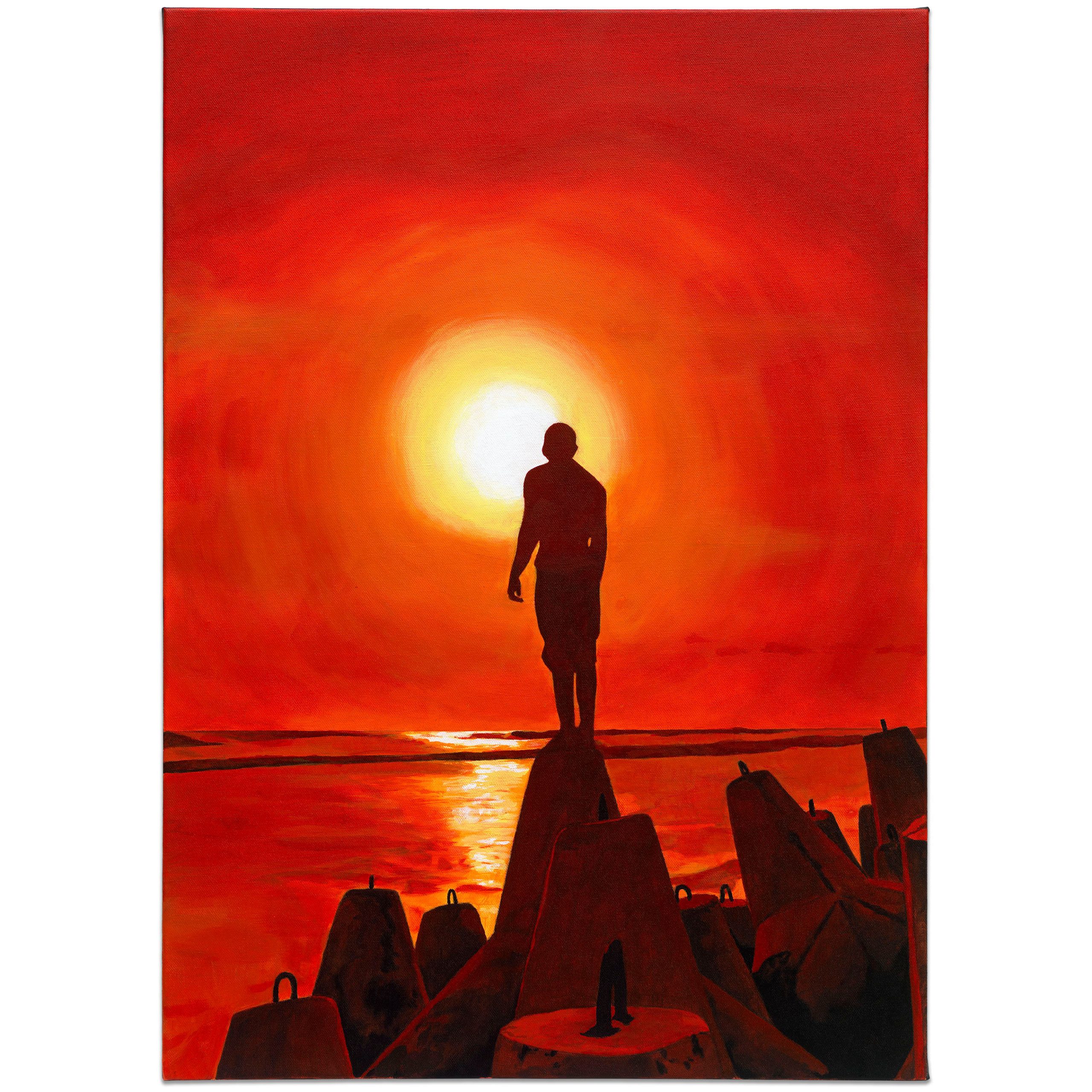 And I Alone by Nean captures a solitary figure standing on an ocean barrier, gazing into the vastness of a sunset. The warm glow of yellow, orange, and burnt orange immerses the viewer in a tranquil moment of solitude, inviting reflection on the power of isolation.