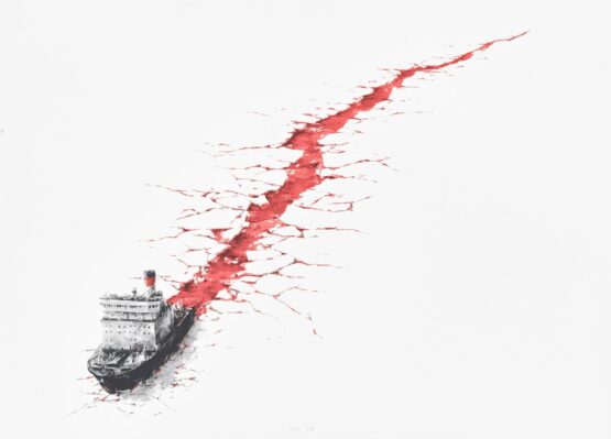 Pejac’s “Wound” screen print is a striking artwork that conveys a powerful message about the devastating impact of human activity on the environment. The image depicts an ice breaker leaving a bloody scar as it roams the frozen ocean, representing the irreversible damage caused by our actions.