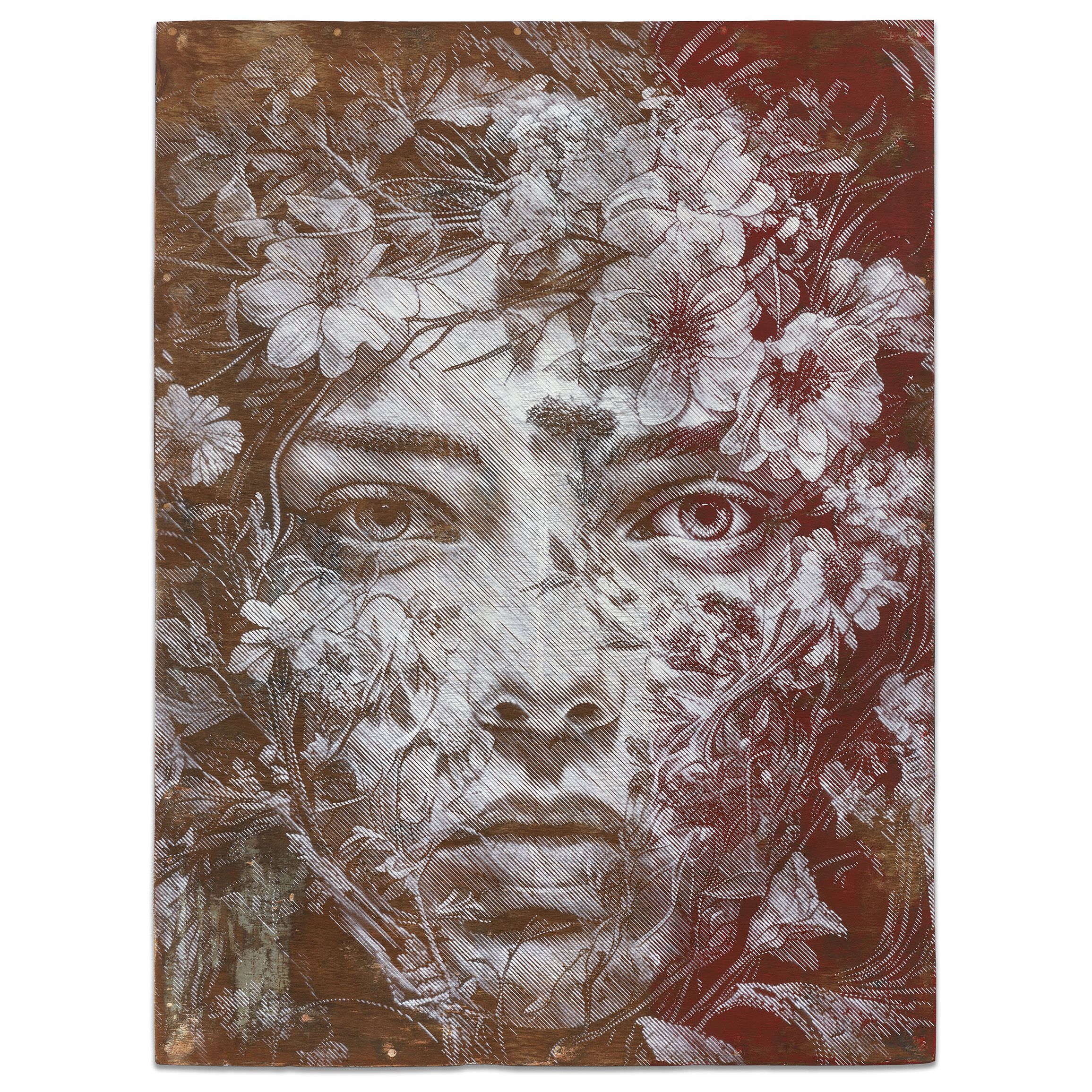 Executed through SNIK’s intricate layered stencil technique, the portrait unfolds gradually through finely controlled sprays of light and shadow. Petals and stems drift across the surface like a living veil, suggesting the gentle reclaiming presence of nature.
