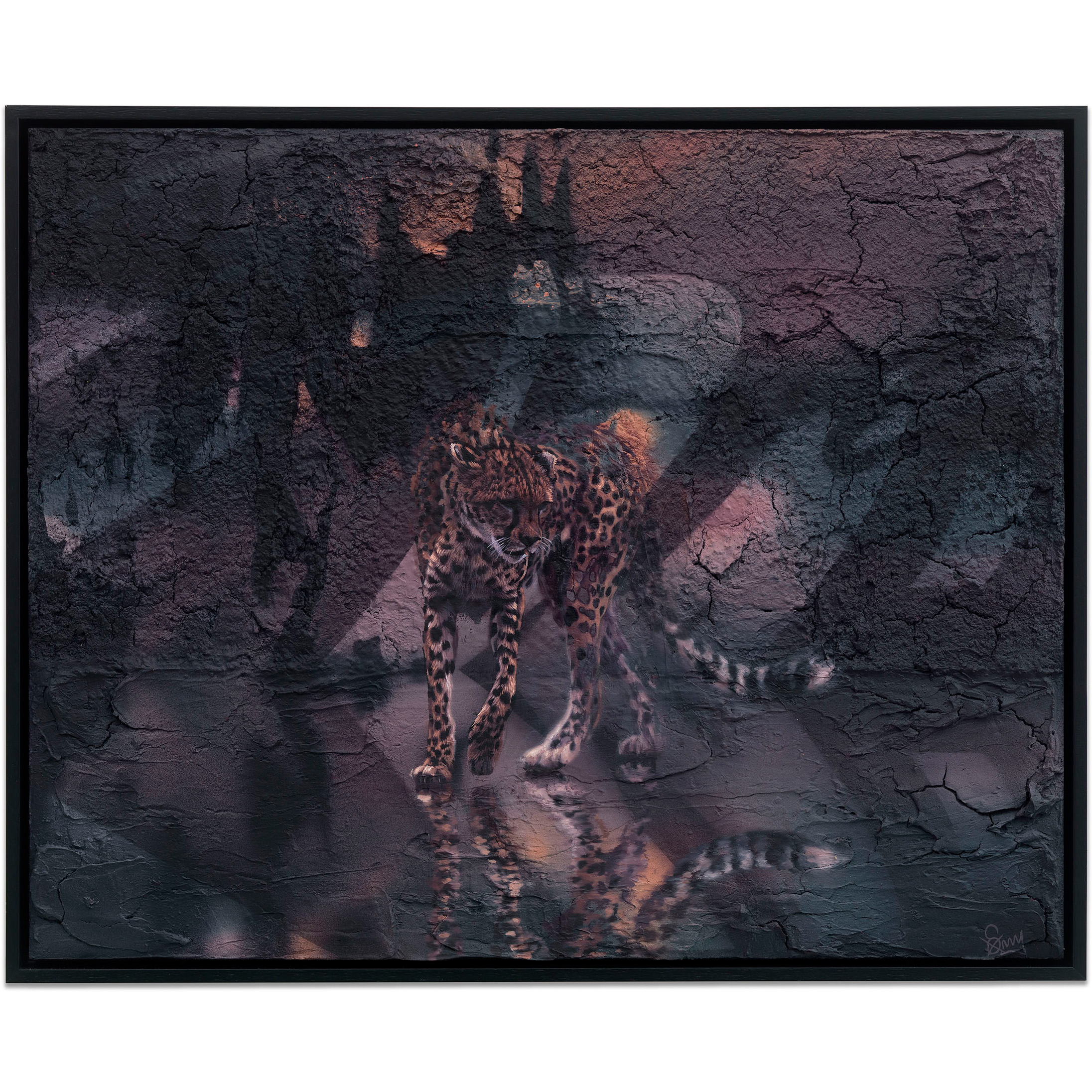 Smouldering Light is set against a fractured, textured backdrop where a cheetah emerges like a memory—an ephemeral figure drifting through a dreamlike terrain that bridges the urban and the wild.
