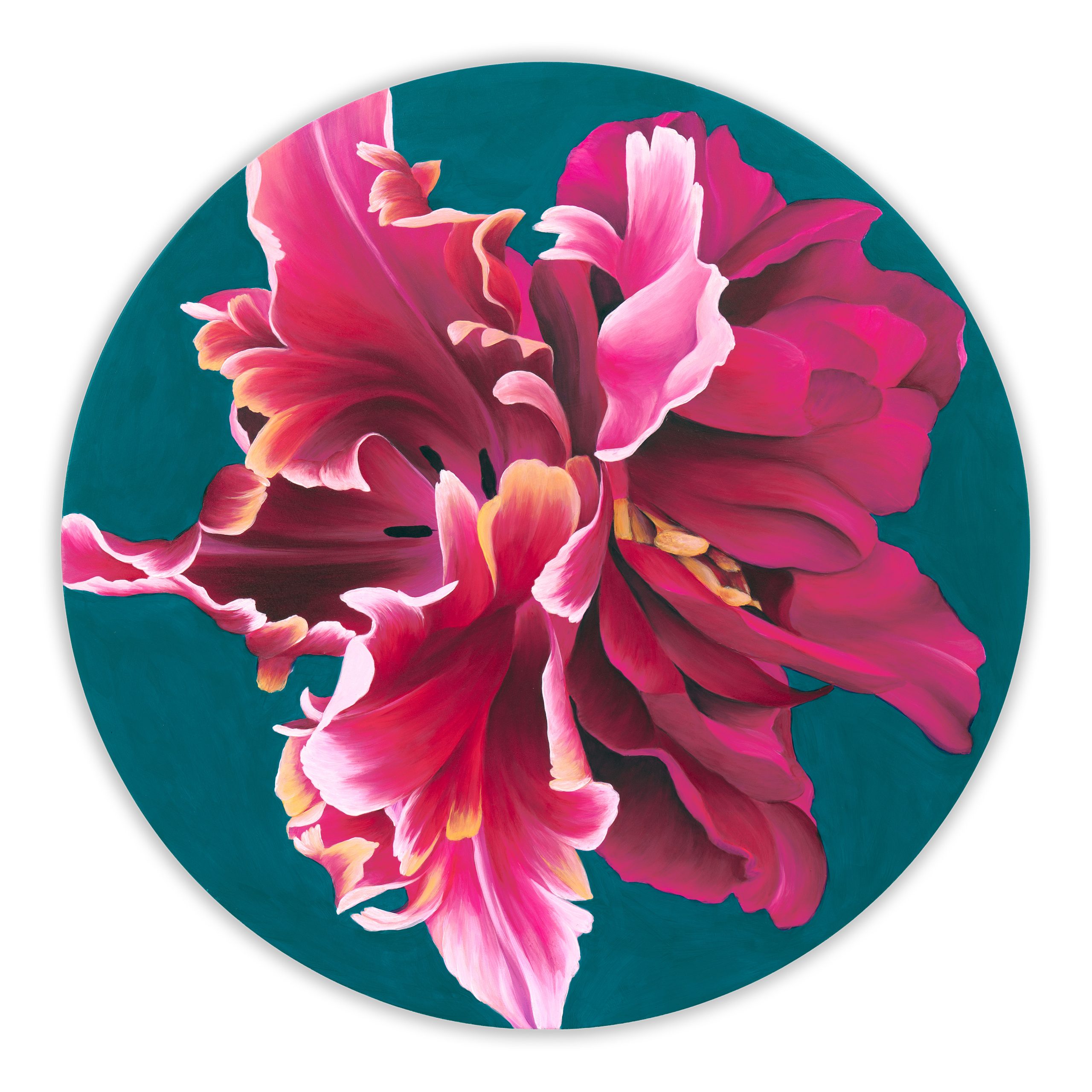 Equinox unfolds within a circular horizon, echoing the brief moment when day and night stand in equal measure before shifting onward. A bloom of tulips expand across the surface with quiet momentum, their petals pressing outward rather than settling into symmetry.