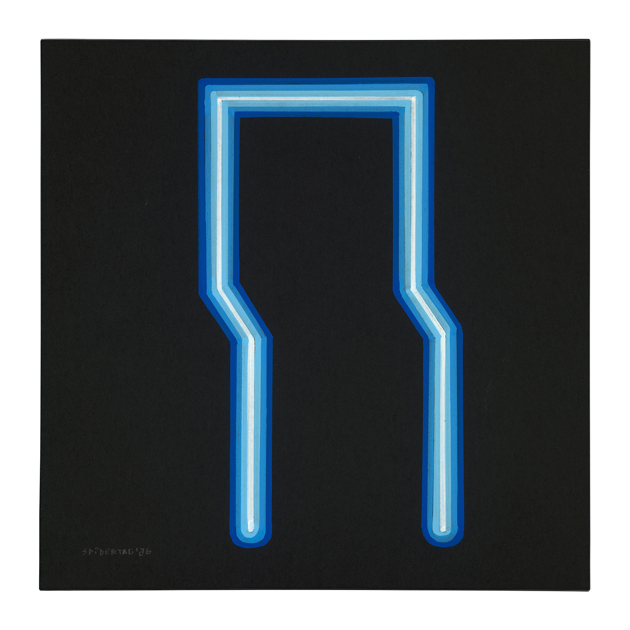 Blue Angle /26 forms part of a series of hand-drawn works in which Spidertag translates the visual language of his neon murals into a reduced, intimate format. Executed with acrylic markers on black paper, each drawing presents a single geometric form rendered in luminous blue, appearing to emit light from within the surface.