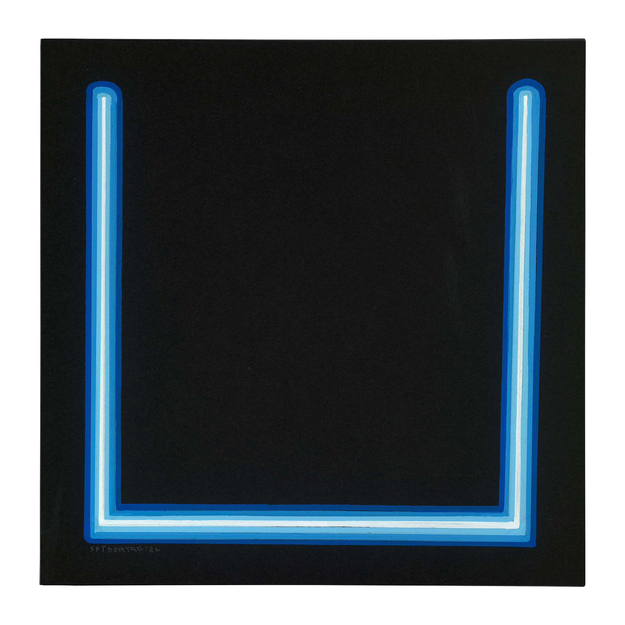 Blue Gate /26 forms part of a series of hand-drawn works in which Spidertag translates the visual language of his neon murals into a reduced, intimate format. Executed with acrylic markers on black paper, each drawing presents a single geometric form rendered in luminous blue, appearing to emit light from within the surface.