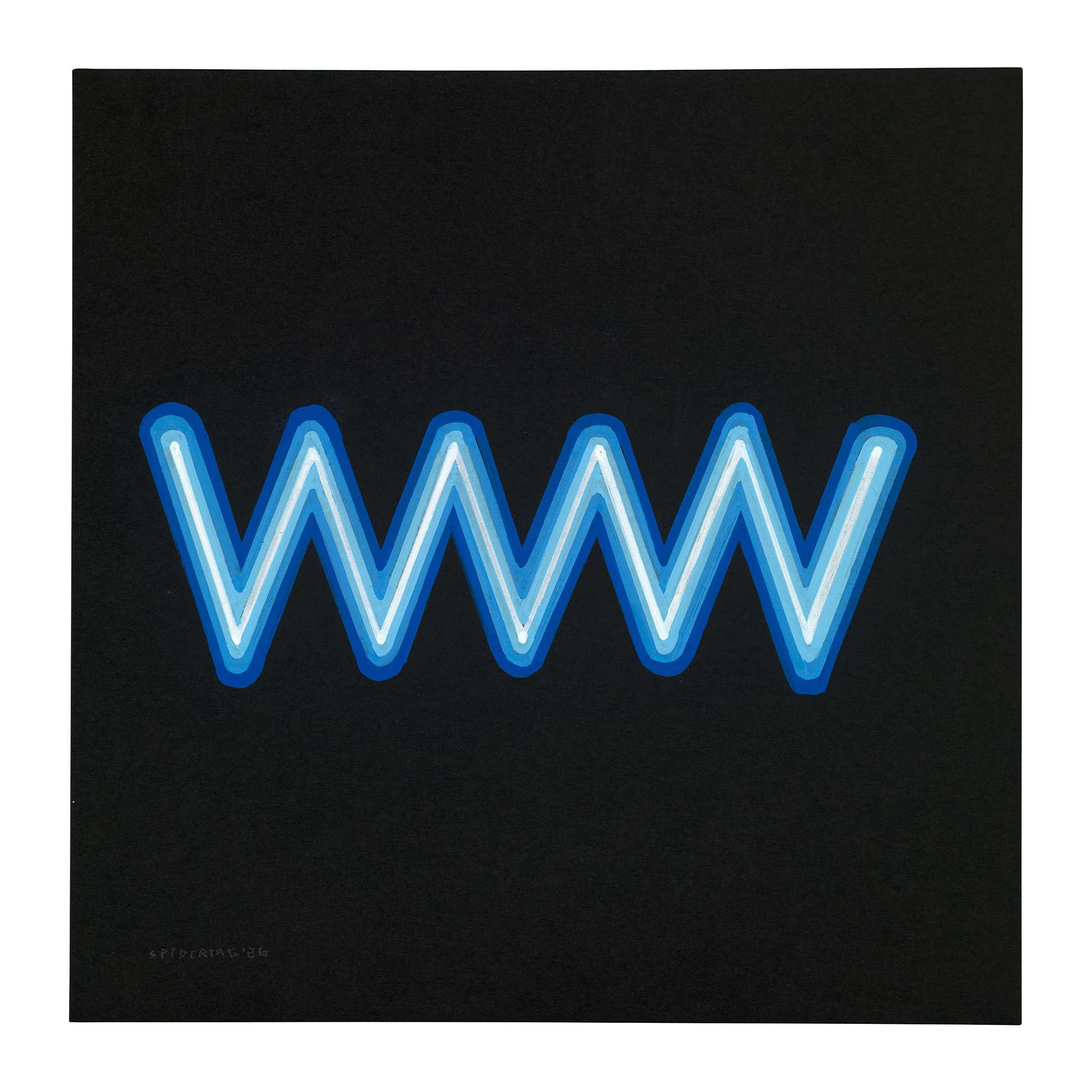 Blue Up/Down /26 forms part of a series of hand-drawn works in which Spidertag translates the visual language of his neon murals into a reduced, intimate format. Executed with acrylic markers on black paper, each drawing presents a single geometric form rendered in luminous blue, appearing to emit light from within the surface.