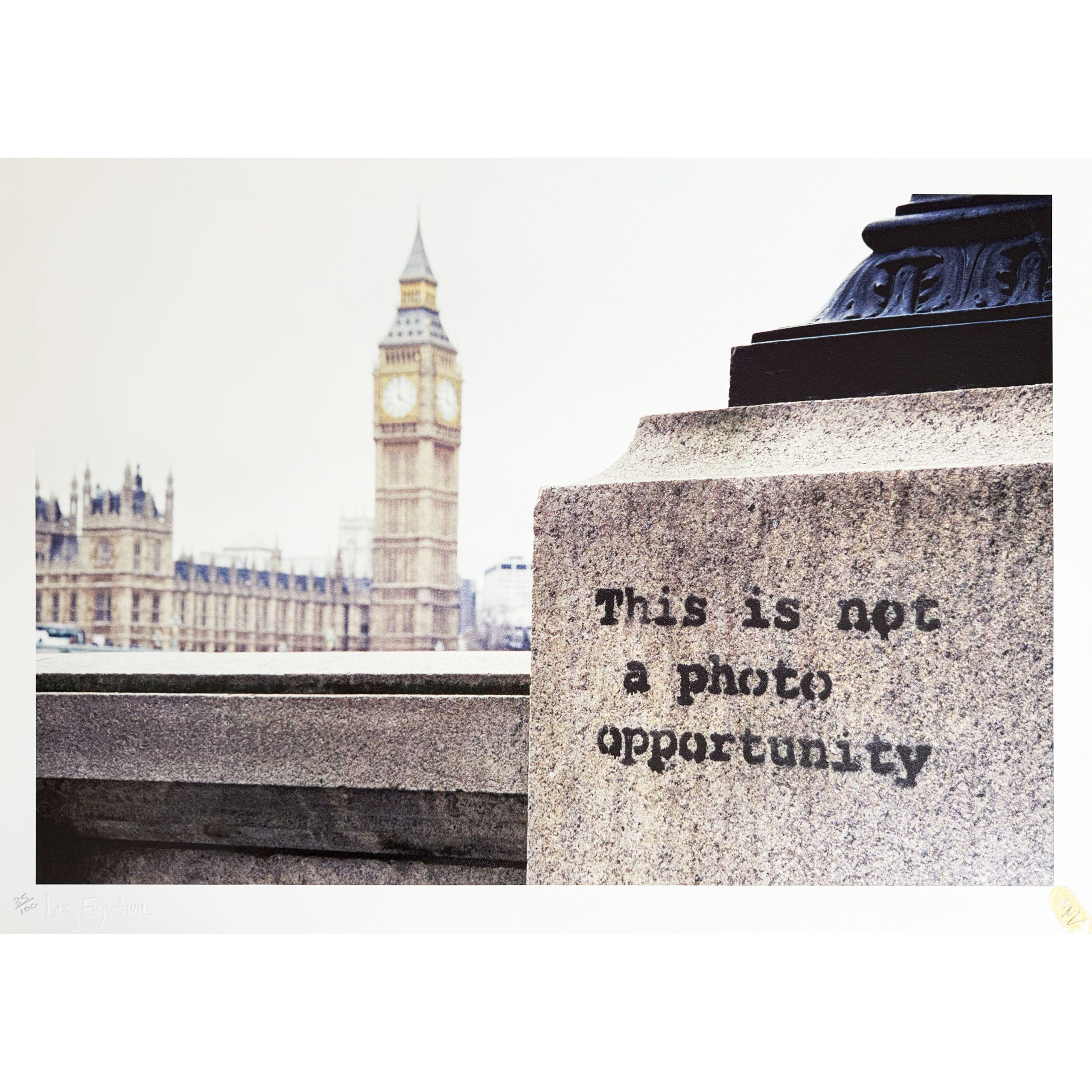 In Photo Op, Steve Lazarides captures one of Banksy’s most incisive street pieces: the phrase “This is not a photo opportunity” sprayed onto a stone wall along London’s South Bank. Across the river, the silhouette of Big Ben and the Houses of Parliament provides a dramatic counterpoint, historic grandeur set against a wry act of anti-establishment graffiti.