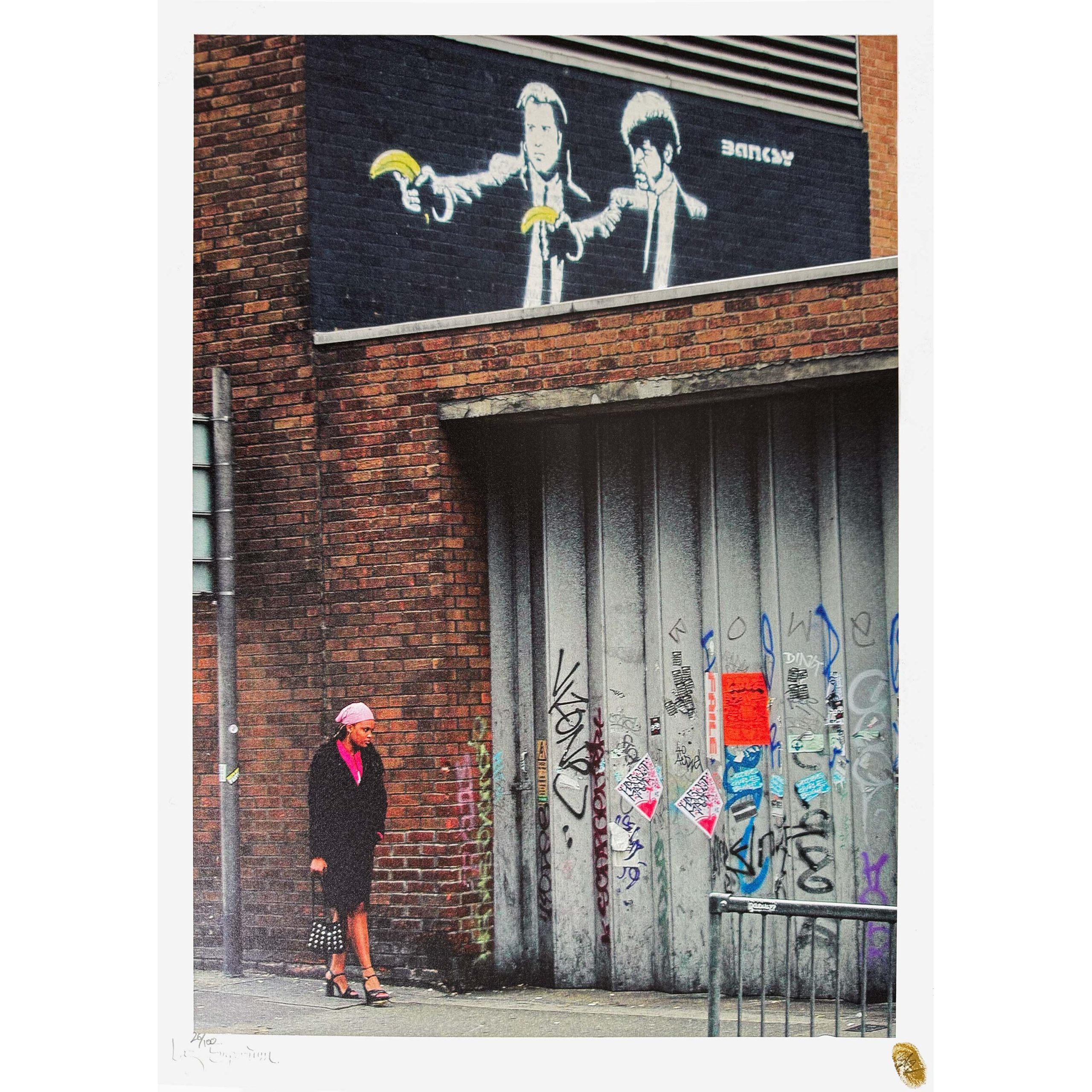 In Streets of Rage, Steve Lazarides captures Banksy’s now-legendary Pulp Fiction mural at Old Street station, painted in 2002. The image reimagines Tarantino’s cult assassins, Travolta and Jackson, brandishing bananas instead of guns, a surreal twist that transforms violence into absurdity and satire.