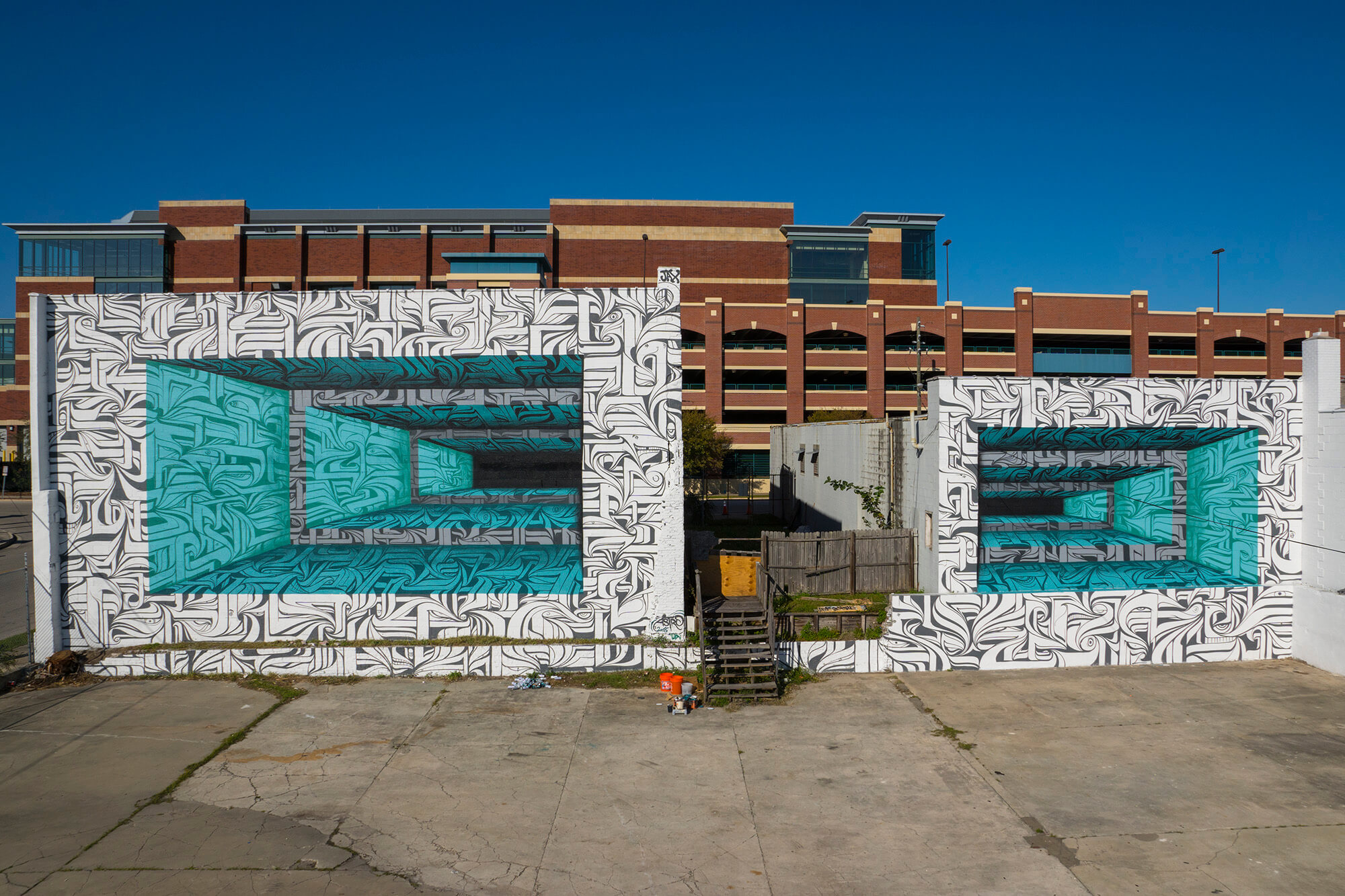 Astro was excited with his walls for Art(Re)publicJax, due to their size and adapted himself to the shape of the two walls in order to create an illusion in depth. Astro has created his own world by exploiting the subtlety of shadows and lights, the strength of colours, and the perspective of depths. He specifically chose the turquoise colour because it represented the spirit of Jacksonville well.