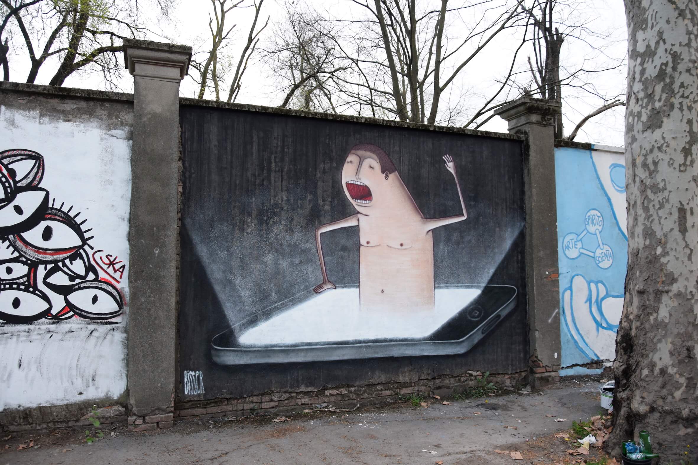 His first mural ‘Smart drowning’ was in Reggio Emilia, in the Emilia-Romagna region of northern Italy. Here he painted, with spray cans and paint, one of his characters drowning in his smartphone, criticising the increasing time spent on smart phones and how over consumption is degrading the users life.