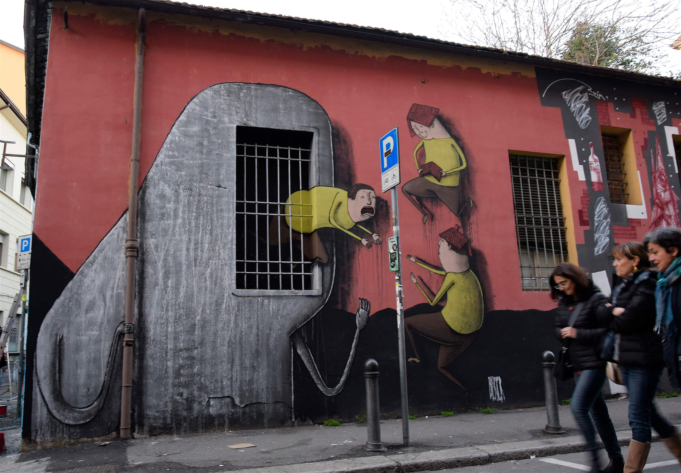 Bisser’s second mural was in Bologna, the largest city of the Emilia-Romagna region. Bisser painted on the squat Làbas with spray paint and paint. His characters are leaving through the abandoned premises and finding themselves homes, as Bisser paints roofs for their heads.