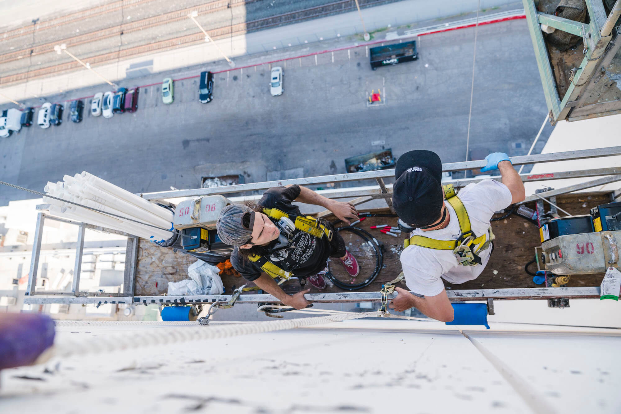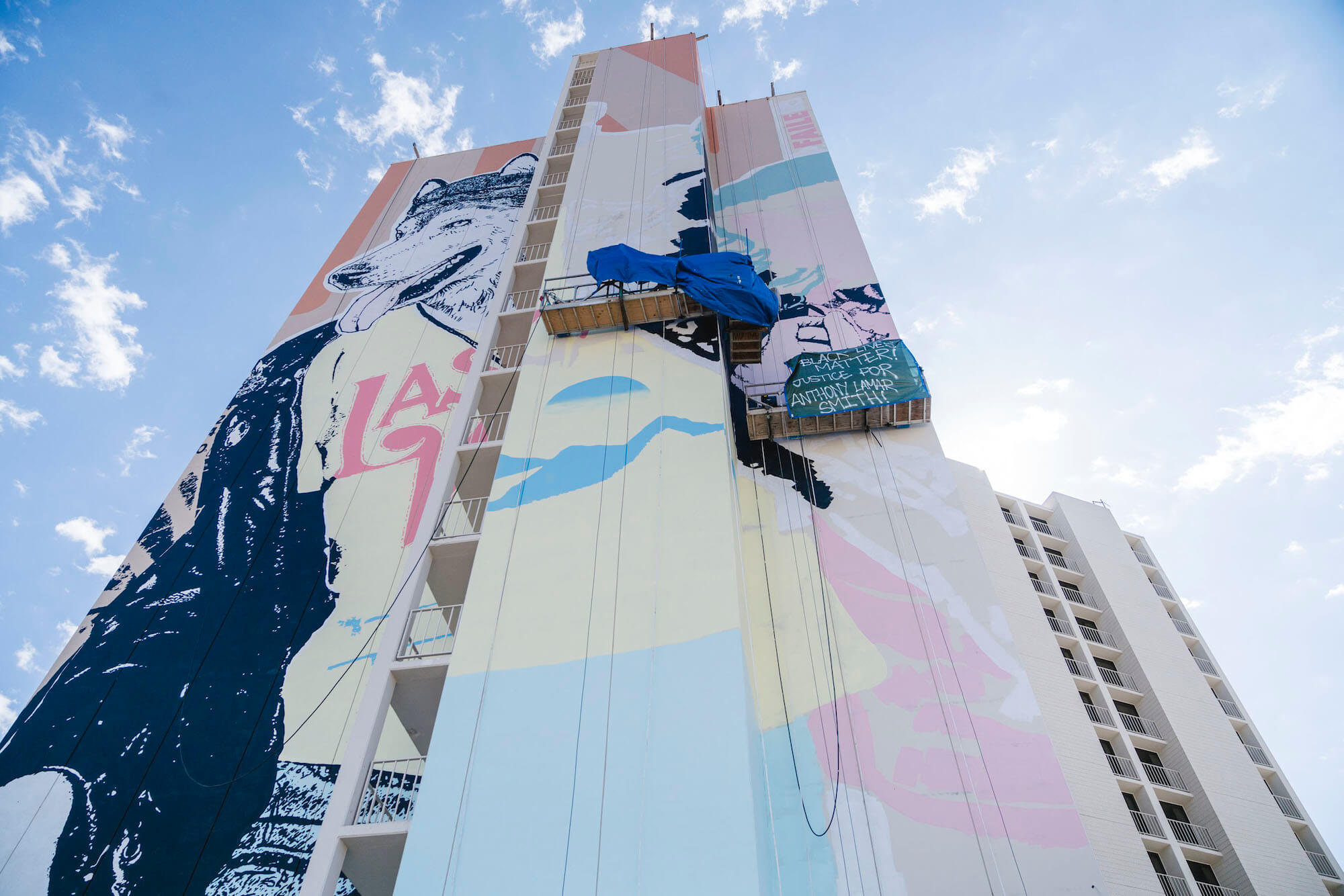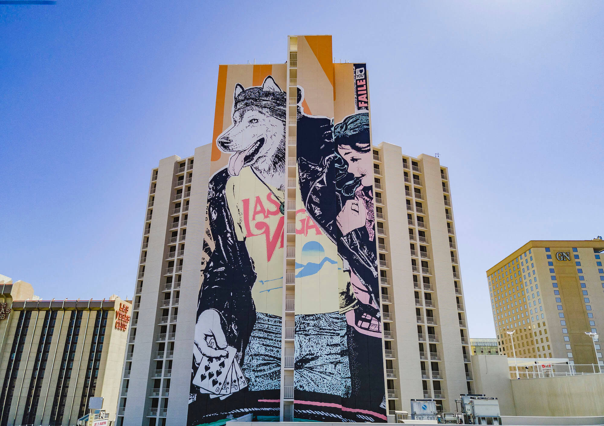 New York street art Faile’s mural is located in the heart of downtown Las Vegas and covers the 21-storey and 1,003 roomed Plaza Hotel & Casino.