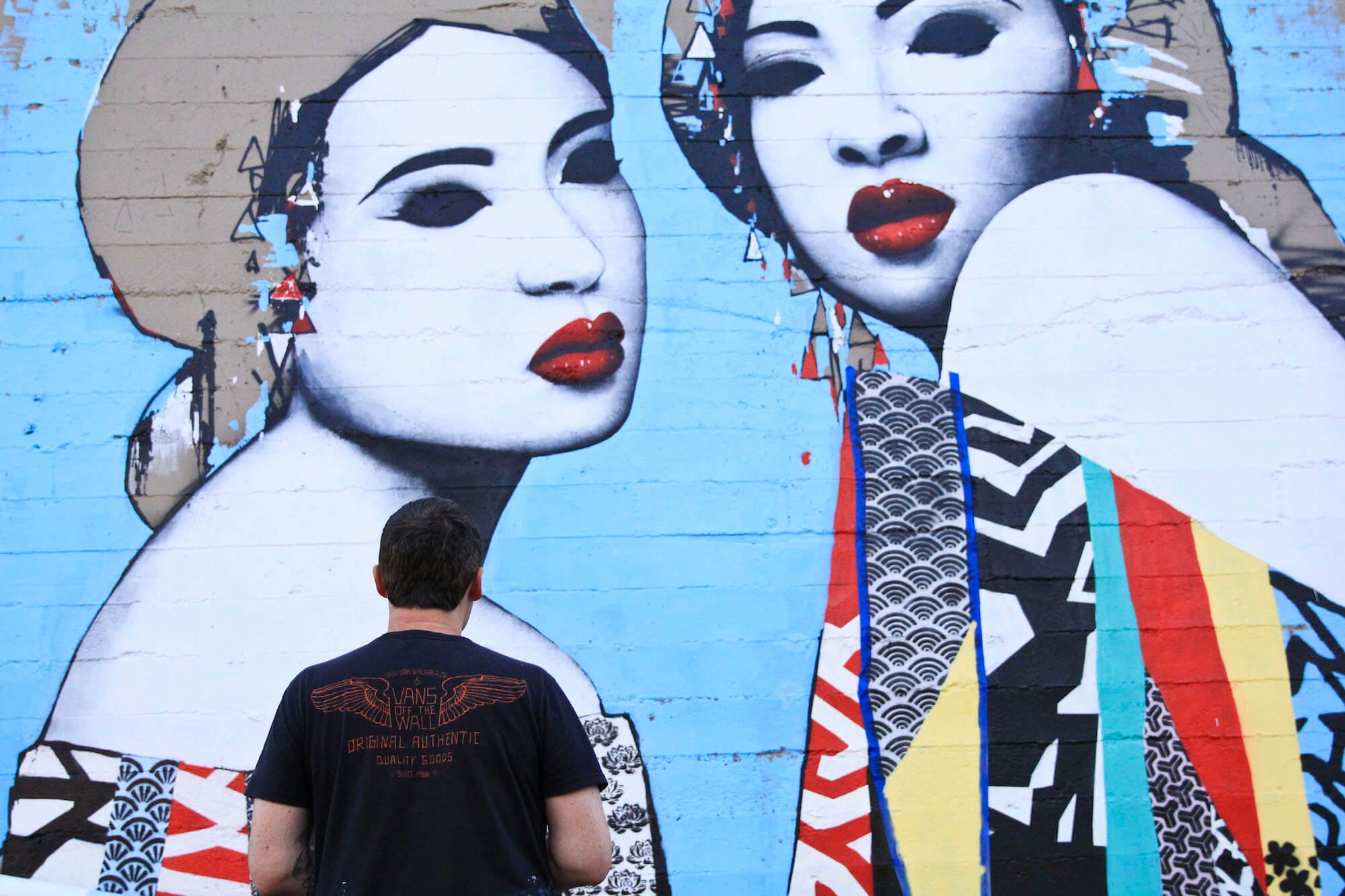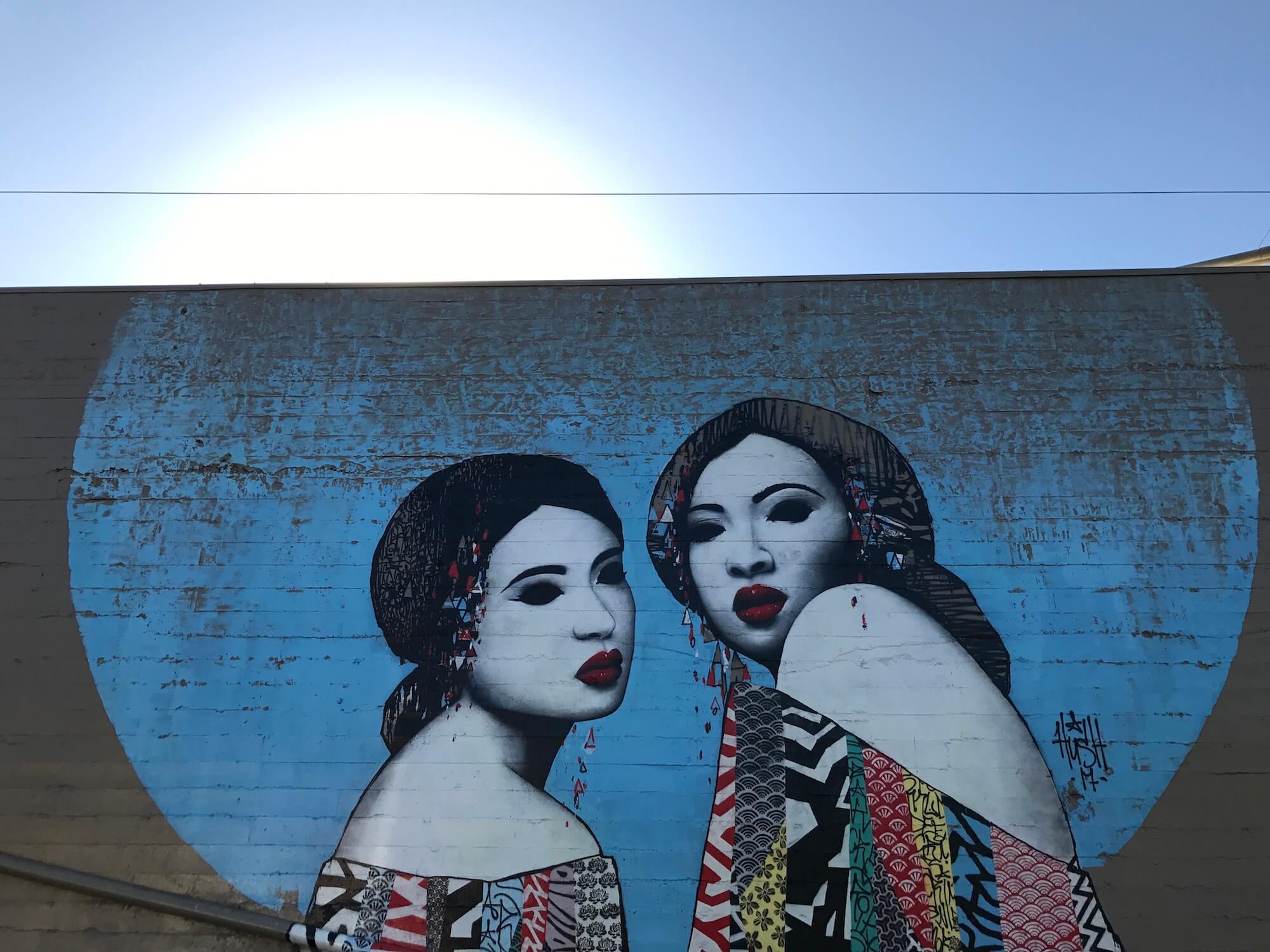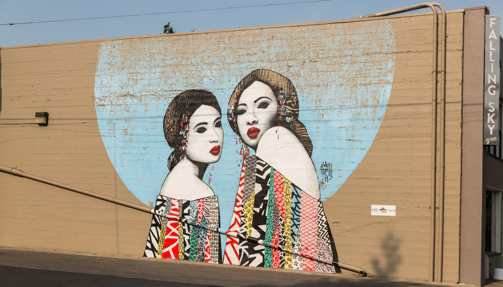 During the 20x21EUG Mural Project’s street art festival, Eugene Walls, the artist painted two of his famous geishas on the east wall of Falling Sky Brewing House & Gastropub, providing a rich pop of blue and graphic elements to the tan wall.
