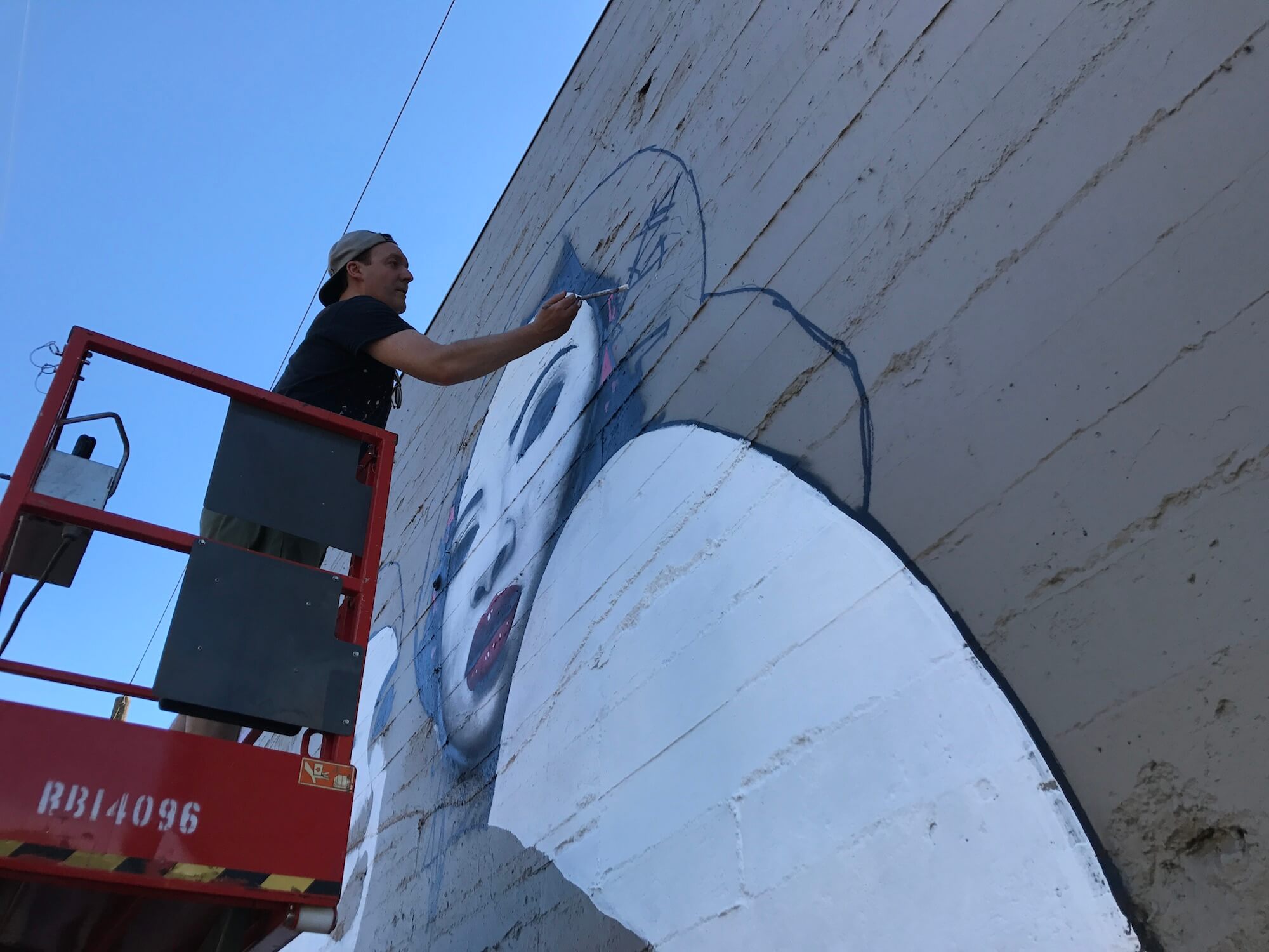 He started with a blank slate and using projections, outlined the future mural before spending several days in the heat creating this phenomenal masterpiece.