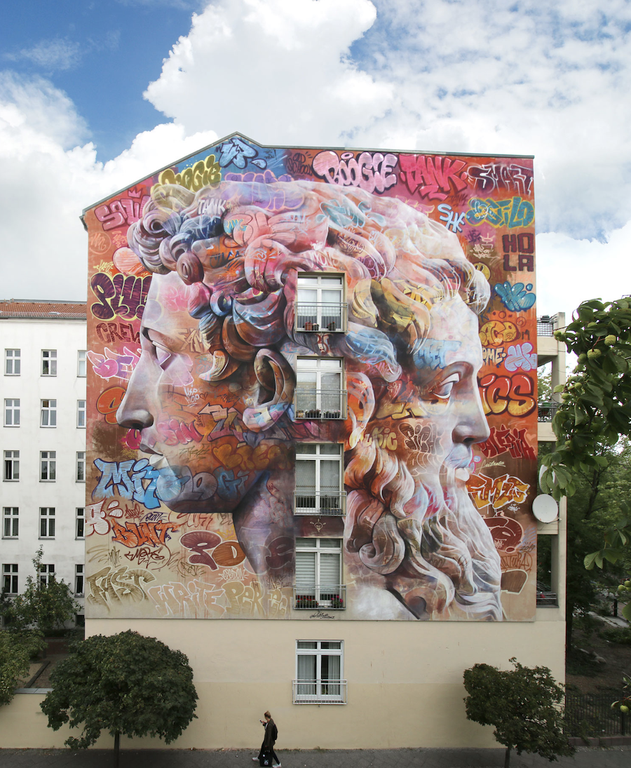 The Valencia-based street art duo PichiAvo has achieved international recognition for their distinctive fusion of classical and contemporary urban art. Through a masterful interplay of mythological sculpture and modern graffiti techniques, they create vibrant, large-scale compositions that bridge the gap between antiquity and the present. Their work not only celebrates the grandeur of classical art but also reimagines it within the dynamic language of today’s urban culture.