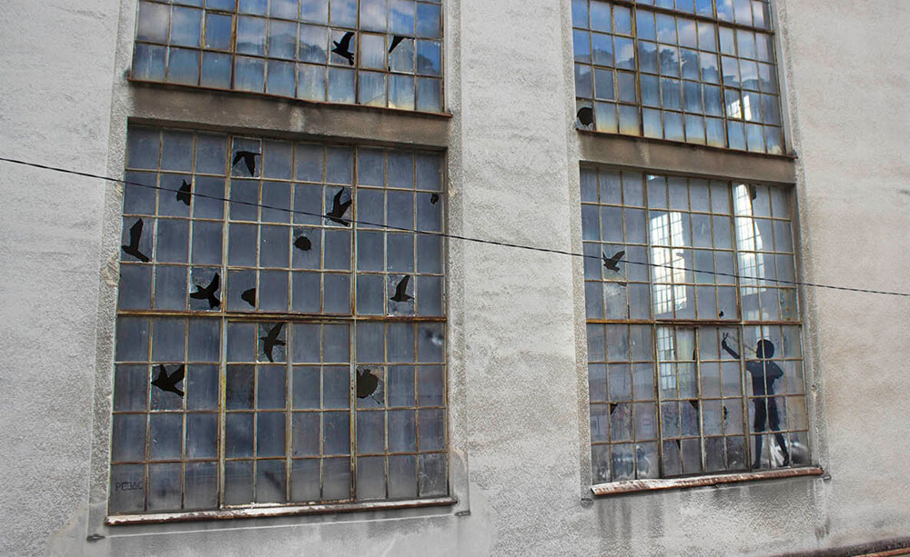 His first contribution was a tribute to René Magritte titled ‘Camouflage’. Belgian surrealist artist Magritte became well-known for a number of witty and thought-provoking images. Often depicting ordinary objects in an unusual context, his work is known for challenging observers’ preconditioned perceptions of reality. Pejac managed to conquer this tribute with a young boy throwing rocks smashing windows and then cleverly carving into the window glass birds in flight.