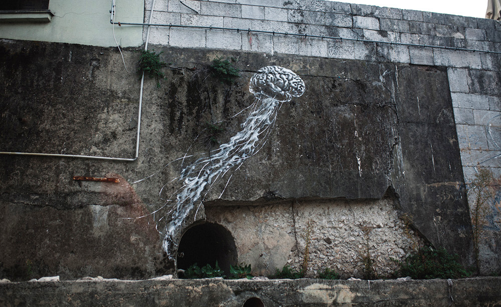 His second mural was titled ‘Brain Drain’ this time referring to the complexity of human mind and how it can be used to inflict pain onto others. He paints a Jelly Fish to represent the human brain.