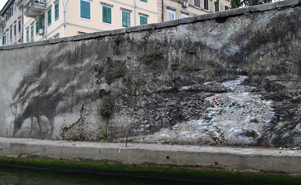 Pejac third mural is titled ‘Ashes to Ashes’. Here Pejac highlights the hunting tourism in Croatia. Pejac scratches off the moss and concrete wall to reveal the animal. Highlighting the animals beauty and natural stance grazing.