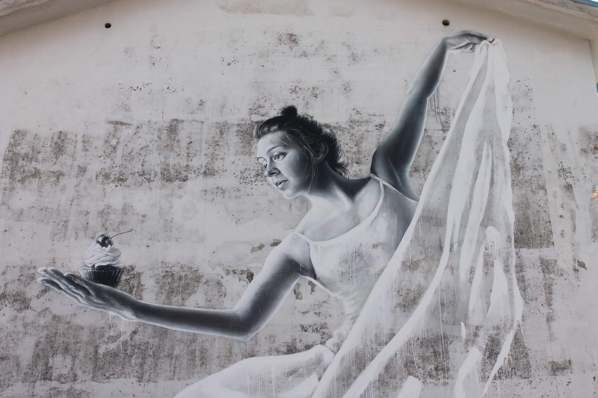 The mural depicts a female dancer on one tiptoe whilst using her arms and right leg to balance.
