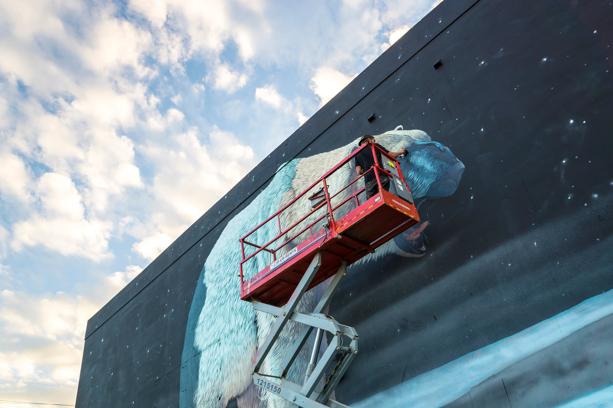 South African based artist, Sonny, has been travelling the world with his latest wildlife protection campaign “‘To The Bone” which aims to raise funds and awareness for endangered wildlife before it’s too late. His latest mural for Basel House is of a Polar bear.