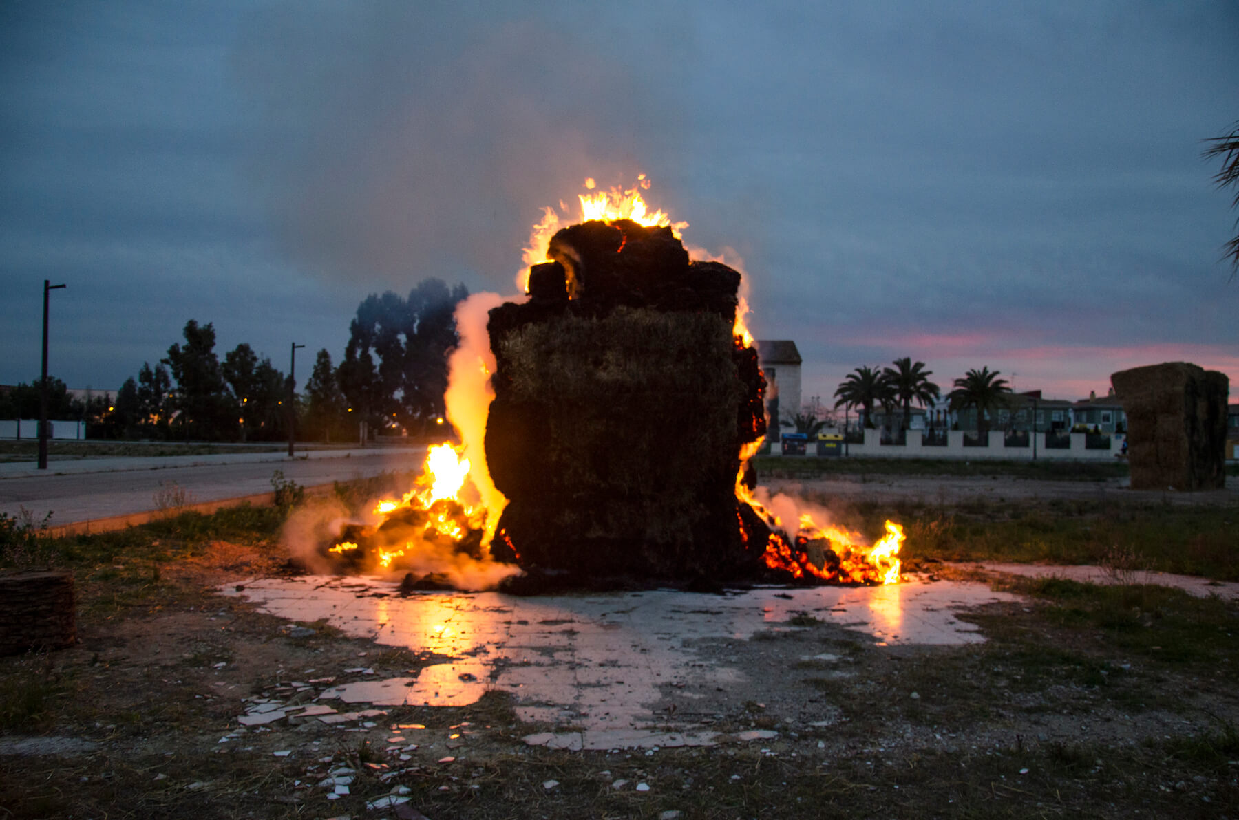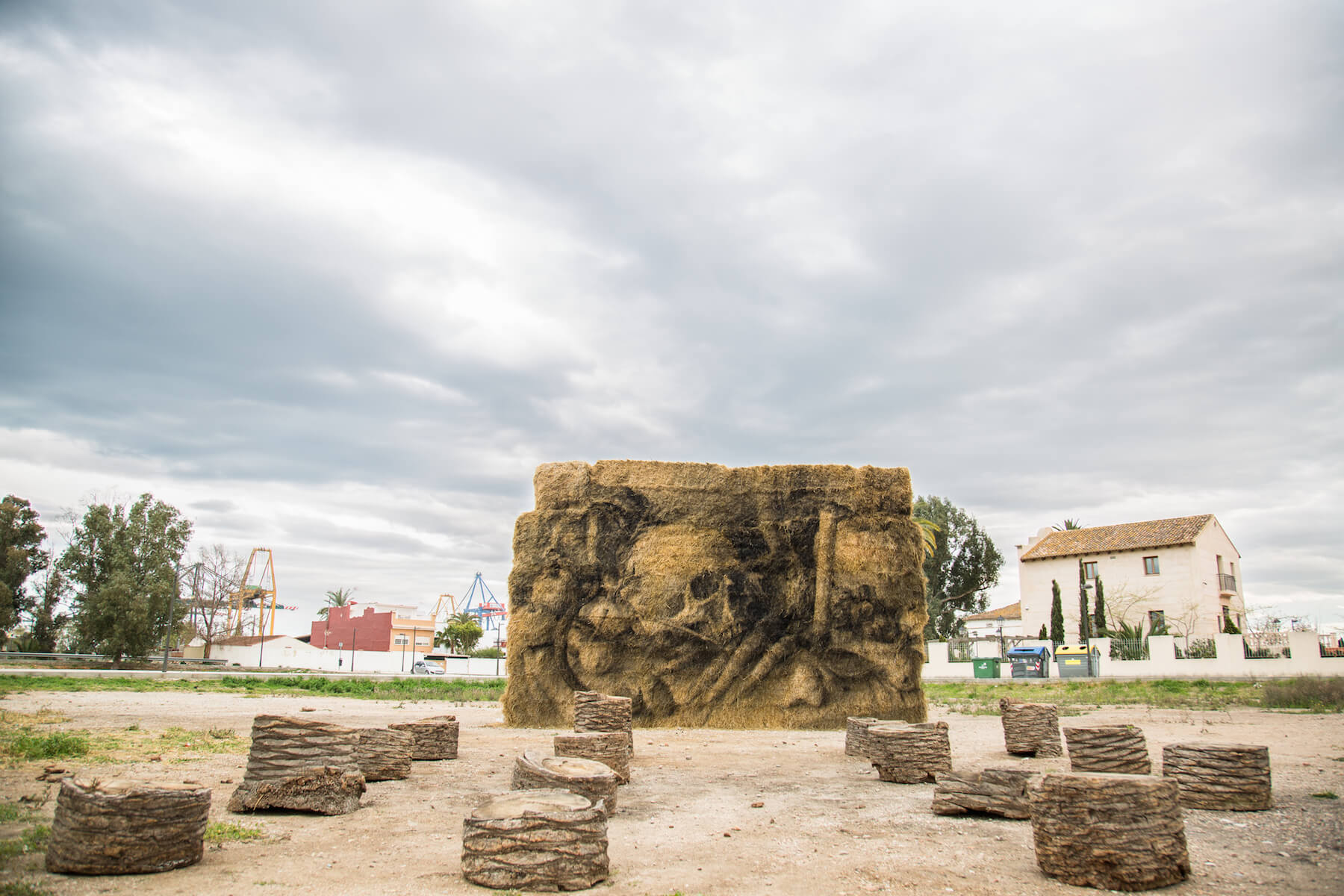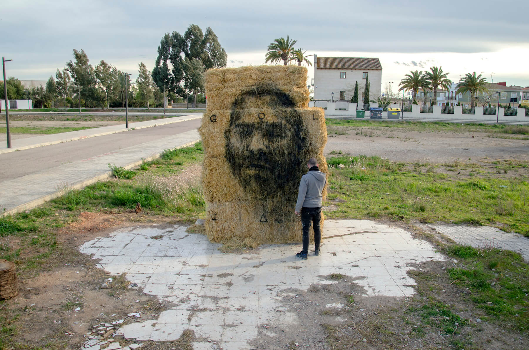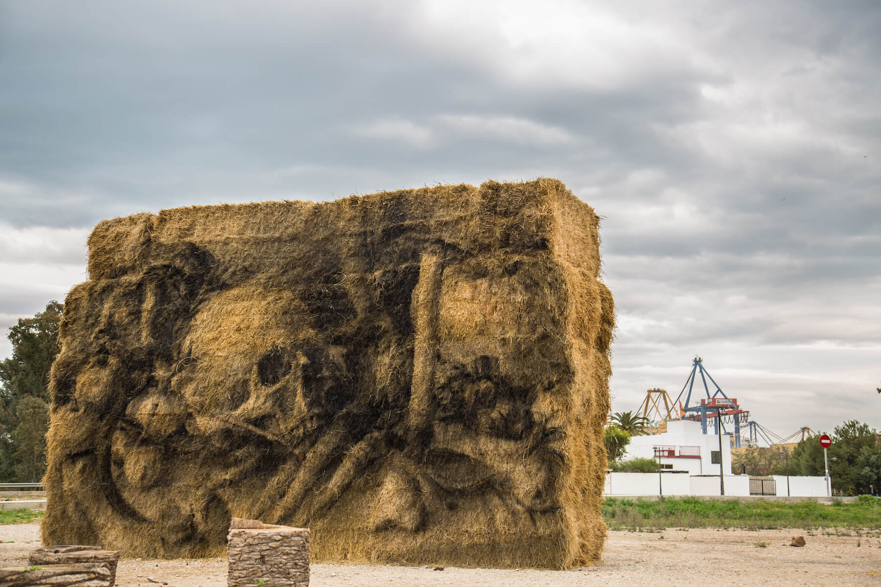 Borondo painted a hand holding onto a ball, entitled ‘Asylum’, also skulls and bones on one of the larger bails of hay in his installation, and the face of ‘Goliath‘ on the other. This was also burnt on Fallas festival on Valencia’s famous crema night. Also