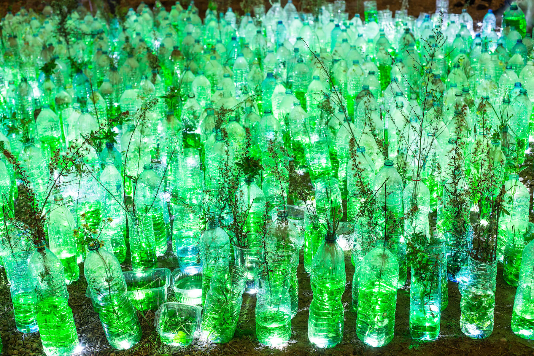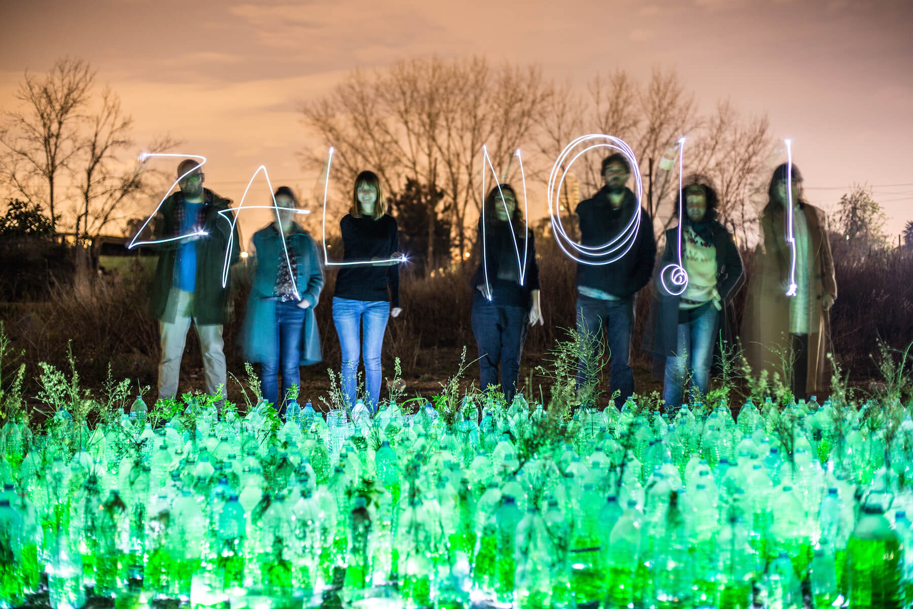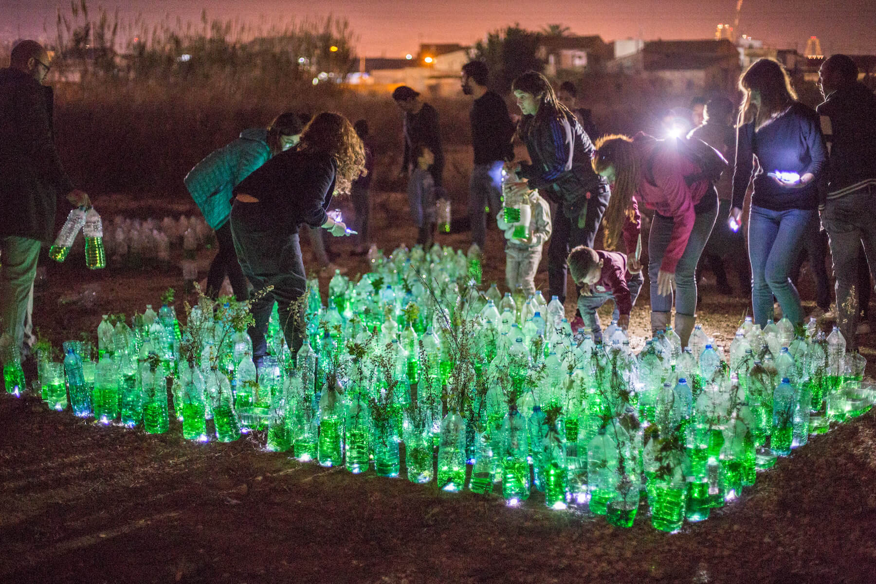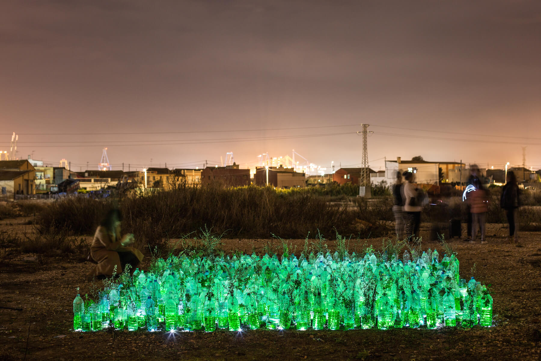 Luzinterruptus collected 1.000 recycled packaging collected by the children of Arca de Noé, the neighbours of the area and the ecopark of Valencia for her installation. Luzinterruptus shaped the transparent packaging, filled with green, into a garden theme.