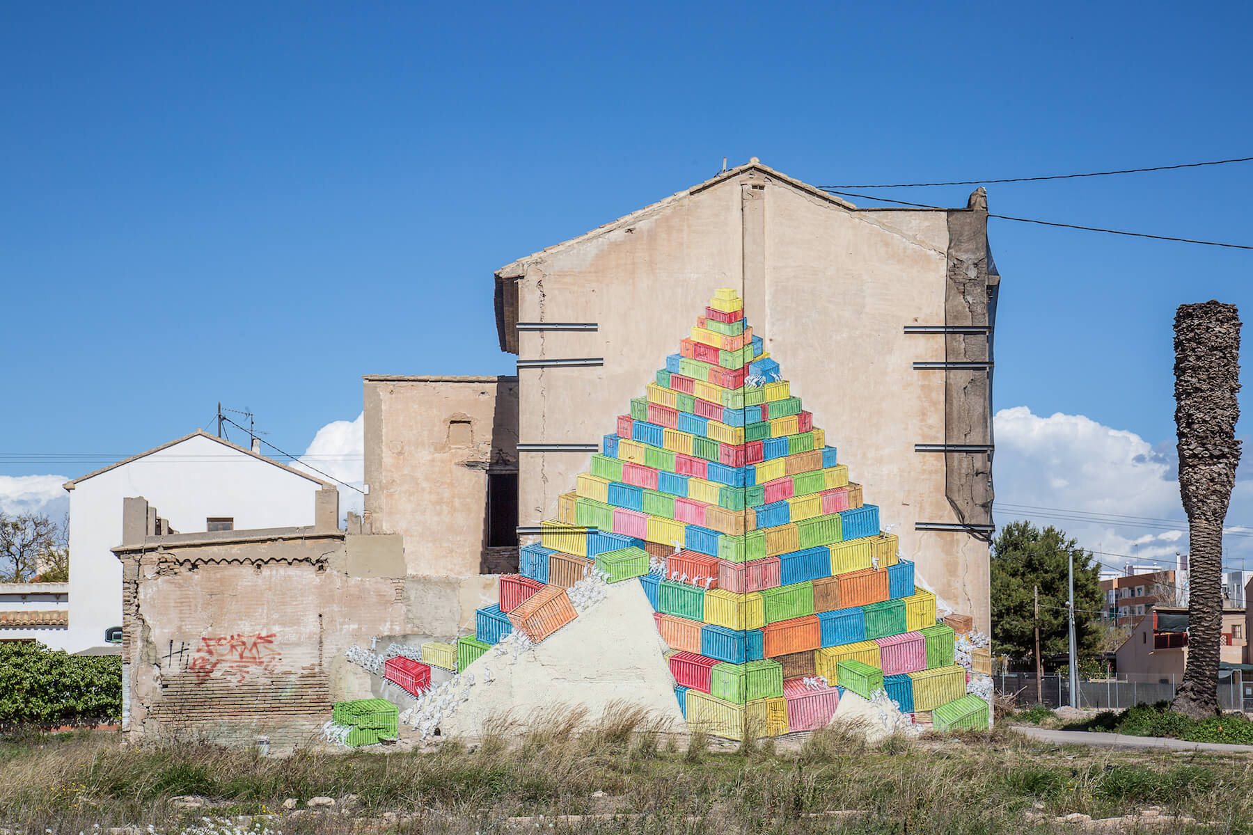 The project “Recuperem La Punta, aturem la ZAL/ Recover the tip, stop the ZAL” collaborated with Escif and brought a great line up of street artists to raise awareness of the importance of protecting La Huerta from further destruction. Invited artists include Hyuro, Blu, Borondo, Aryz, Luzinterruptus, Liqen, Sam3, Anaïs Florin, Daniel Muñoz SAN and Elias Taño to create murals and installations in various places of La Punta to claim that the field of more than 700,000 square metres return to be the vegetable garden that it was for centuries.