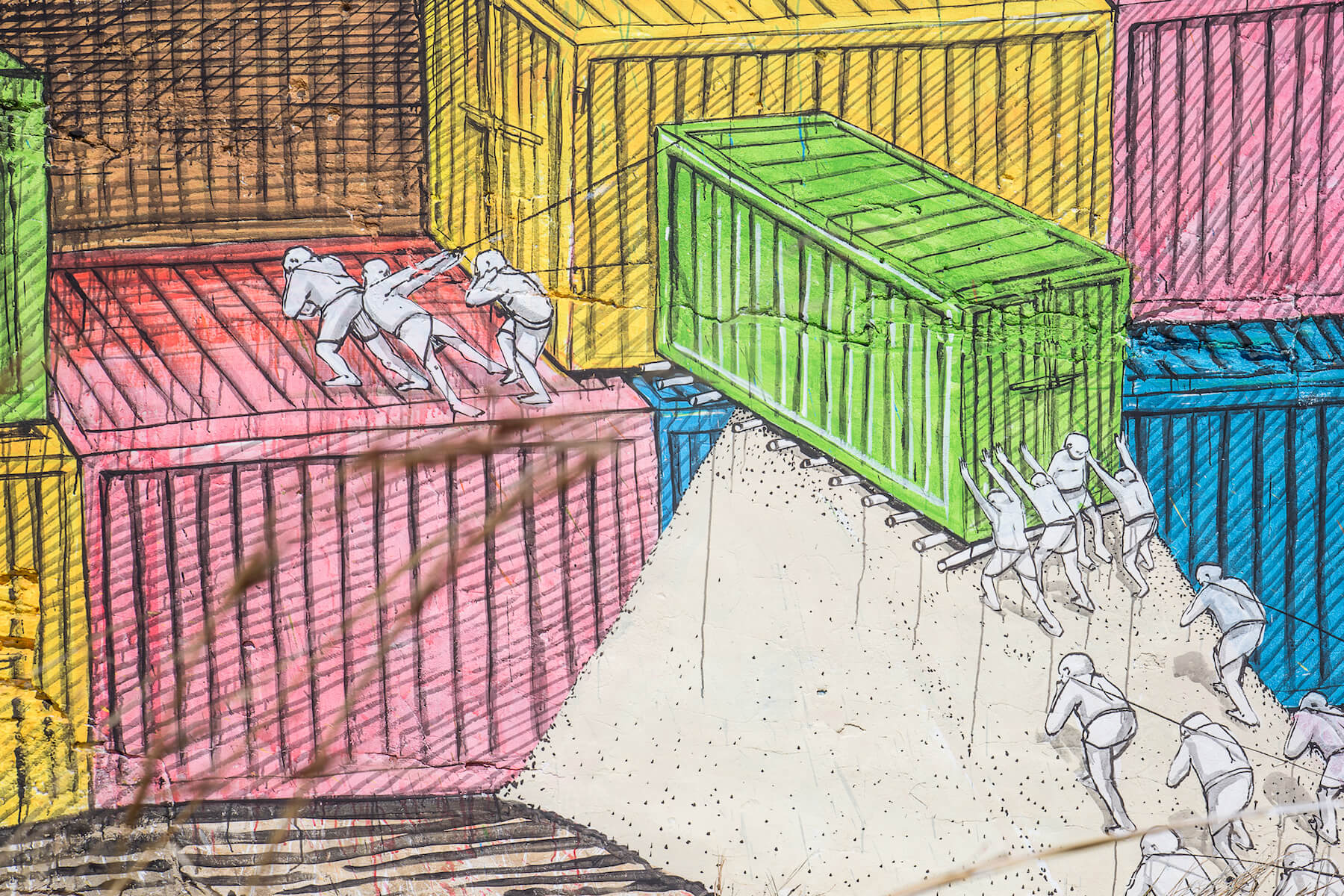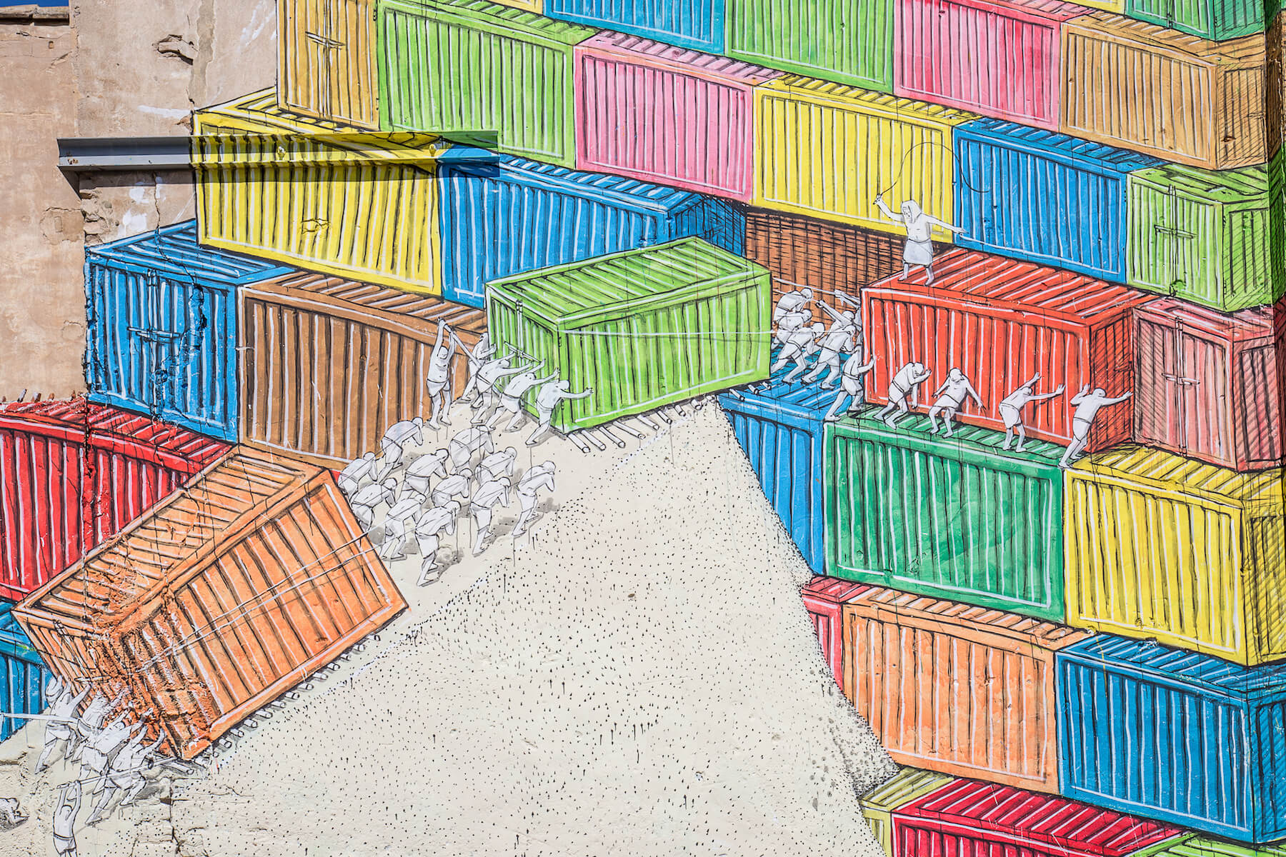 Blu painted a pyramid of colourful storage containers, with reference to the Port and containers used for transportation. Together the neighbourhood is strong and will block the ZAL.