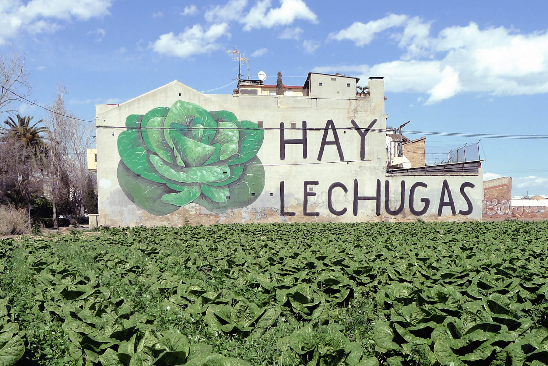 Escif painted two murals to support the campaign. His first mural shows hands holding onto the soil with a home ontop, his second mural is of a lettuce with the words Hay Lechugas/There are lettuces! supporting the 700,000 square metres of land to return to be the vegetable garden that it once was.